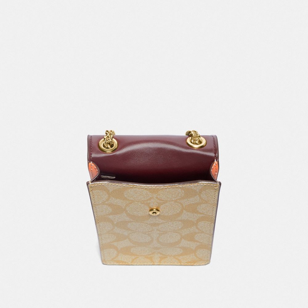 Signature coated canvas and smooth leather| Snap closure| Four outside credit card slots| Strap with 23" drop for shoulder or crossbody wear| 4 1/4" (L) x 7" (H) x 1 1/4" (W)