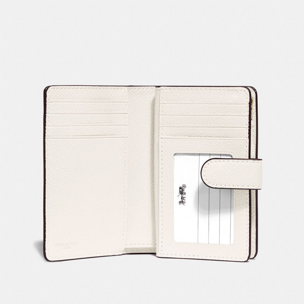 Crossgrain leather| Seven credit card slots| Bill compartment| ID window| Zip pocket| Snap closure| 5" (L) x 3 1/2" (H) x 1/2" (W)