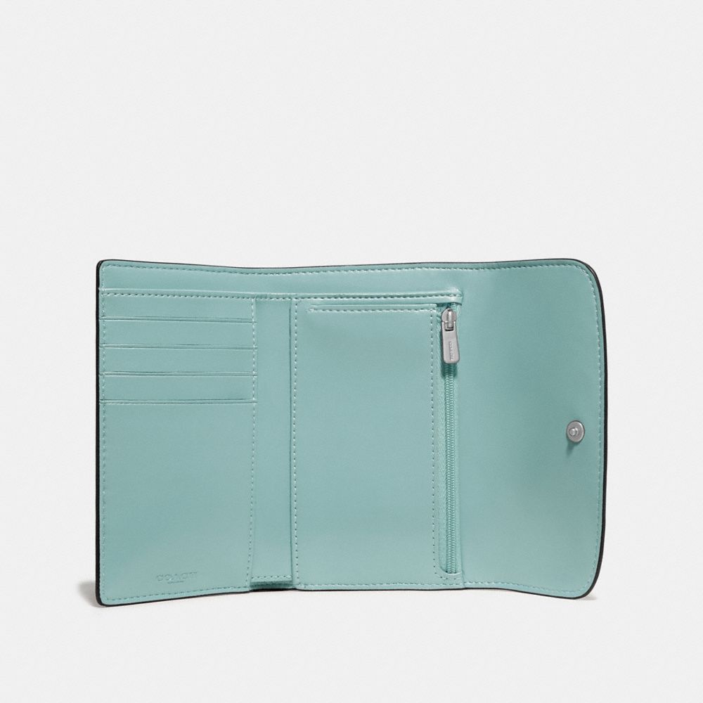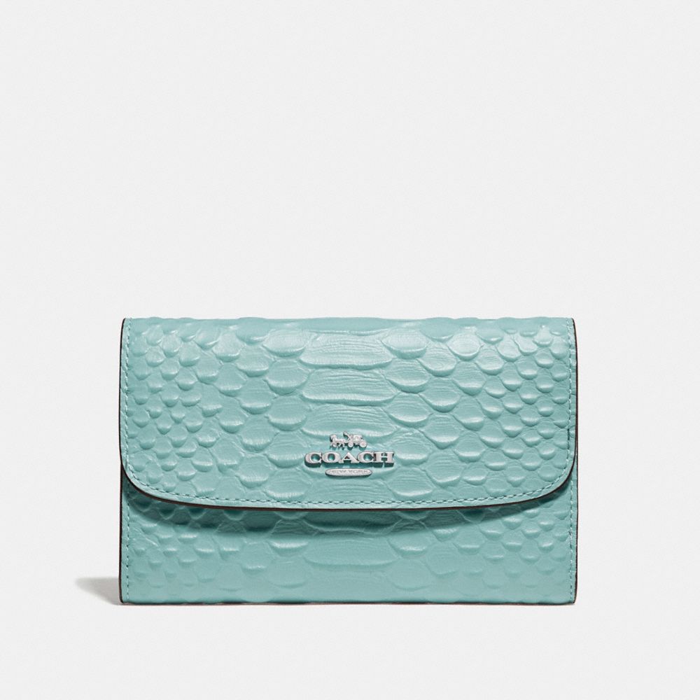 Snake-embossed leather| Four credit card slots| Bill compartment| Inside zip coin pocket| Snap closure| Outside open pocket| 6" (L) x 3 3/4" (H) x 3/4" (W)
