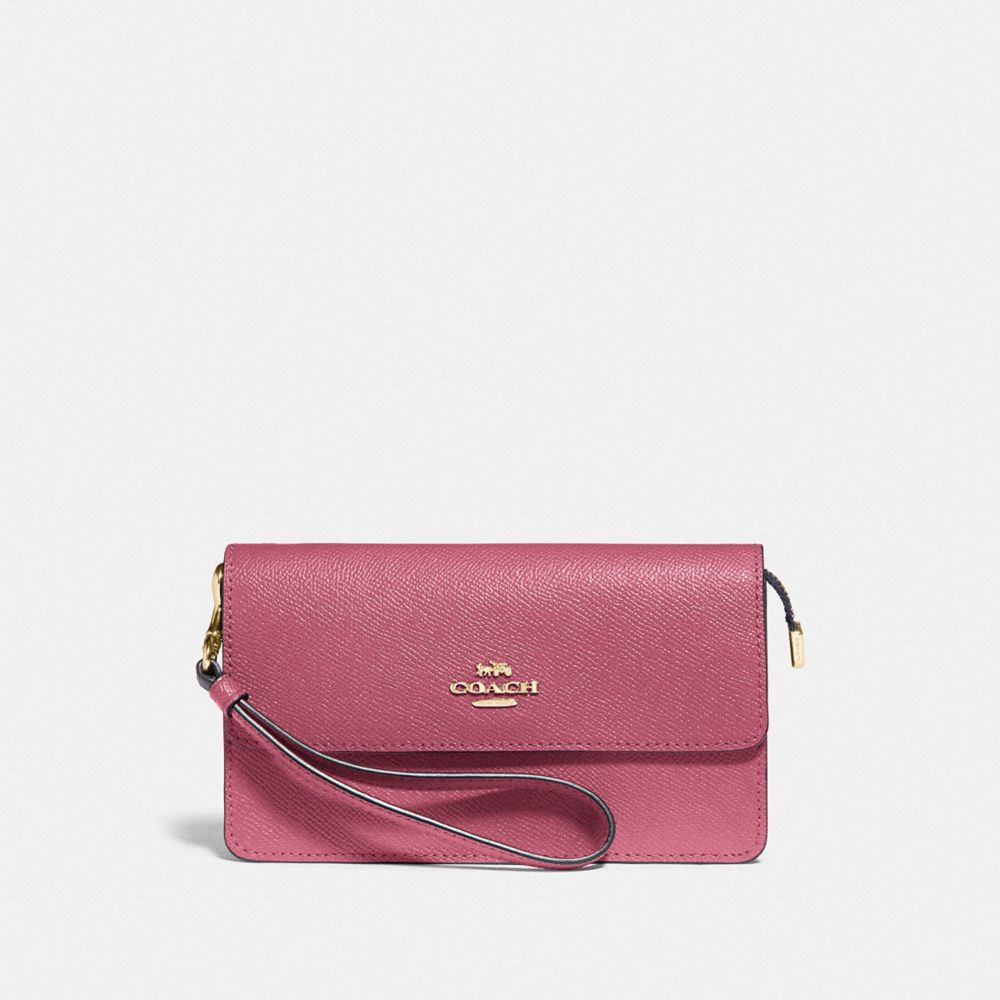 Crossgrain leather| One credit card slot| Snap closure, fabric lining| Outside zip pocket| Detachable wrist strap| 7" (L) x 4" (H) x 1 3/4" (W)