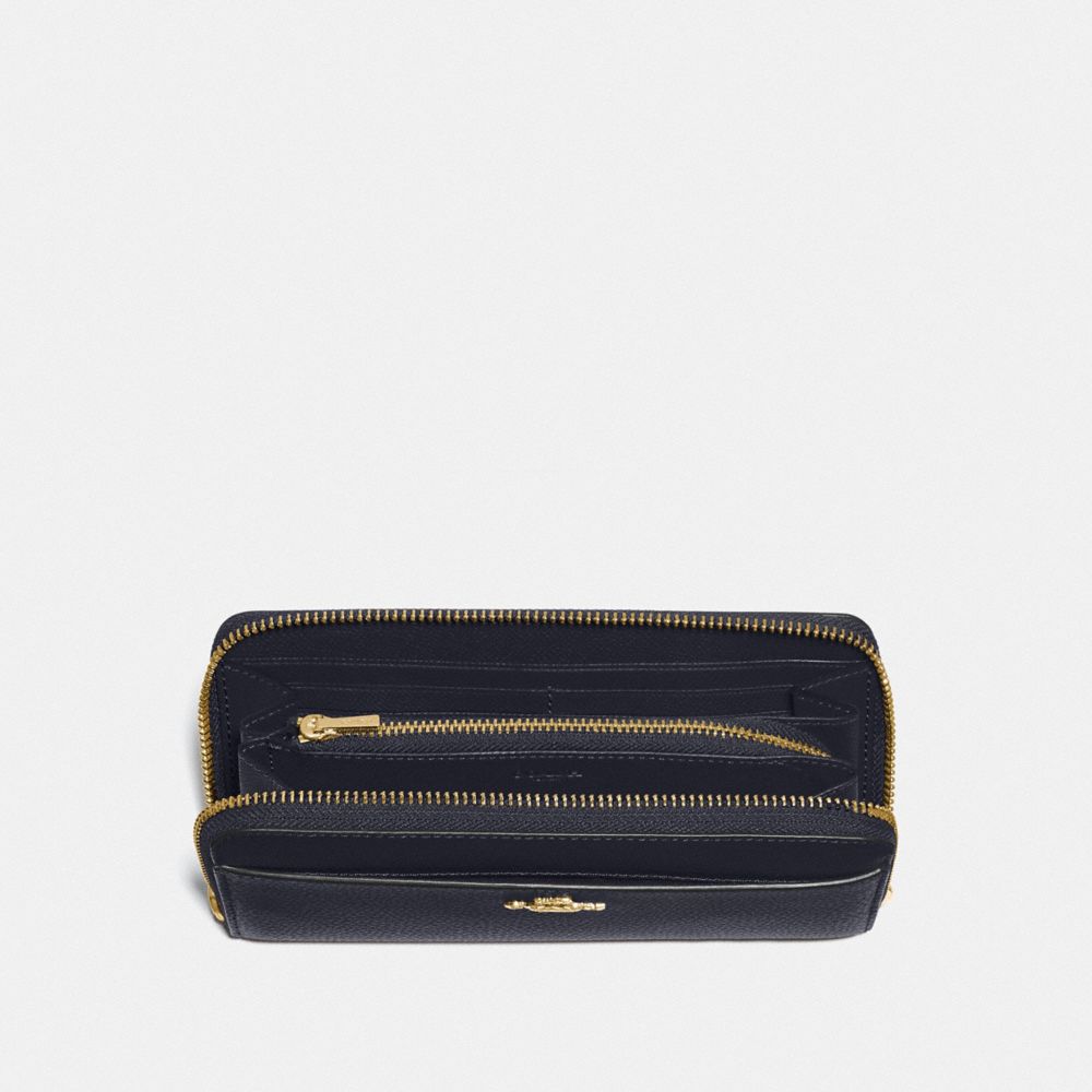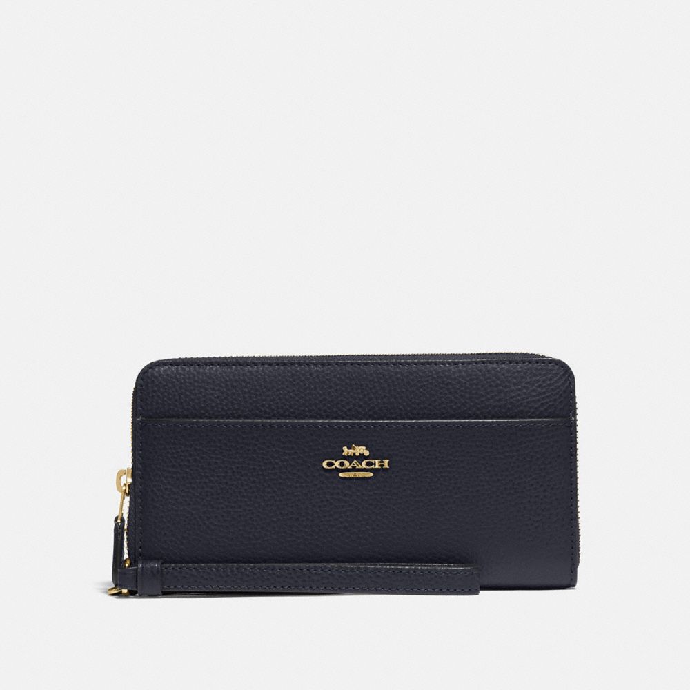 Metallic polished pebble leather| 12 credit card slots| Full-length bill compartments| Zip coin pocket| Zip-around closure| Outside open pocket| Wrist strap attached| 7 1/2" (L) x 4" (H) x 3/4" (W)| Fits all phone sizes up to an iPhone X and Samsung S7 Edge