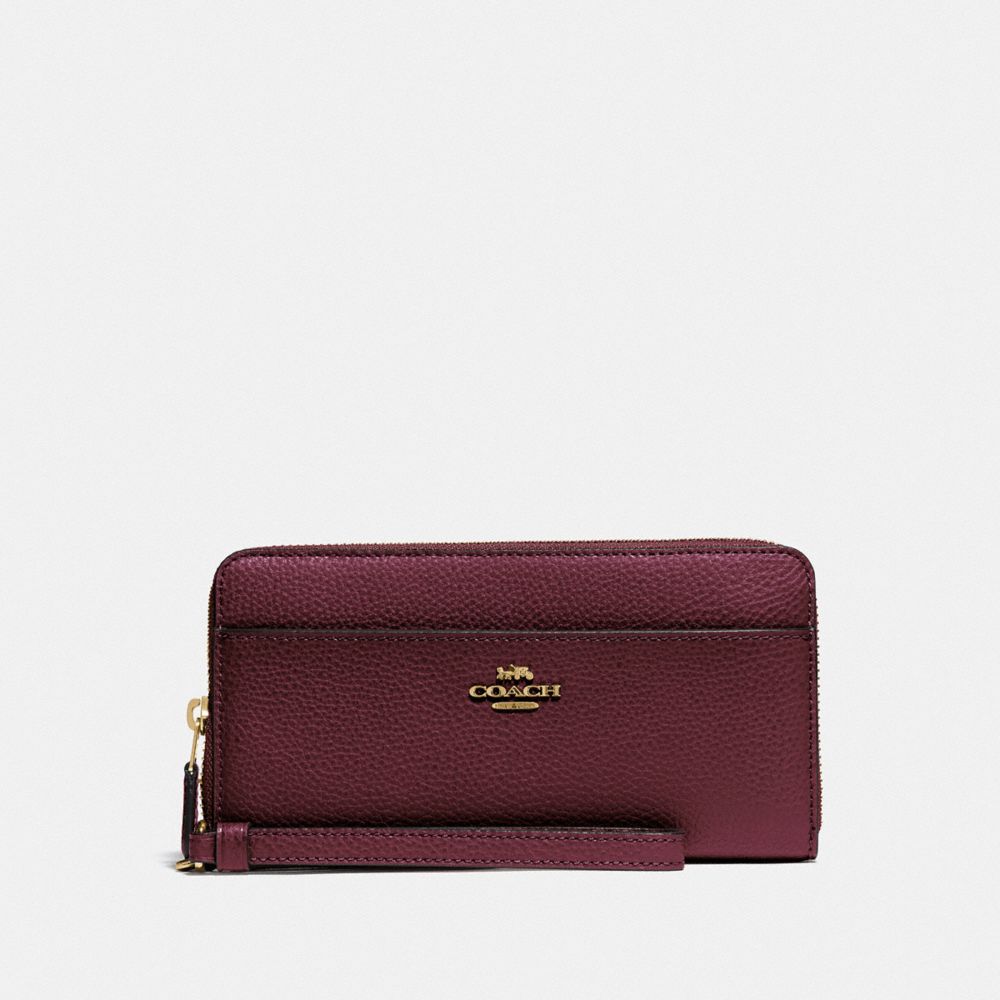Polished pebble leather| 12 credit card slots| Full-length bill compartments| Zip coin pocket| Zip-around closure| Outside open pocket| Wrist strap attached| 7 1/2" (L) x 4" (H) x 3/4" (W)| Fits all phone sizes up to an iPhone X and Samsung S7 Edge