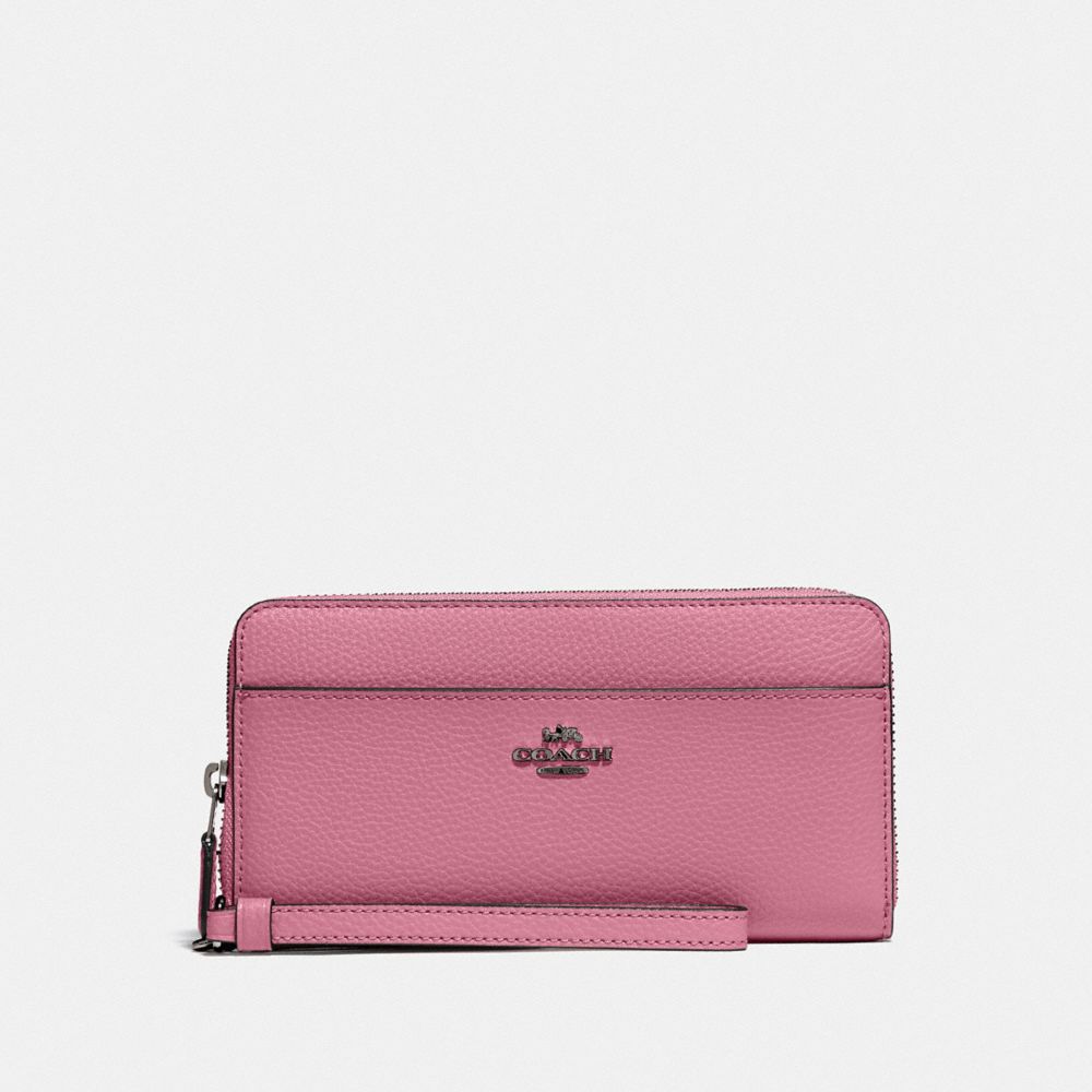 Polished pebble leather| 12 credit card slots| Full-length bill compartments| Zip coin pocket| Zip-around closure| Outside open pocket| Wrist strap attached| 7 1/2" (L) x 4" (H) x 3/4" (W)| Fits all phone sizes up to an iPhone X and Samsung S7 Edge
