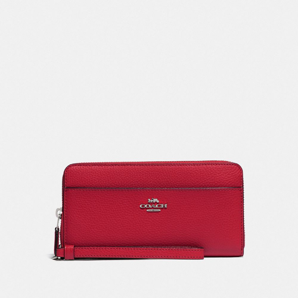 Polished pebble leather| 12 credit card slots| Full-length bill compartments| Zip coin pocket| Zip-around closure| Outside open pocket| Wrist strap attached| 7 1/2" (L) x 4" (H) x 3/4" (W)| Fits all phone sizes up to an iPhone X and Samsung S7 Edge