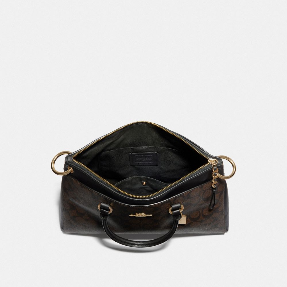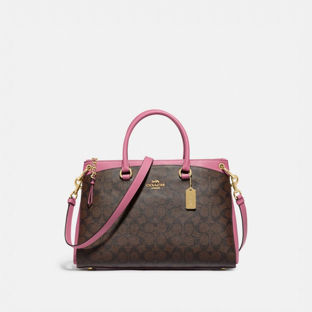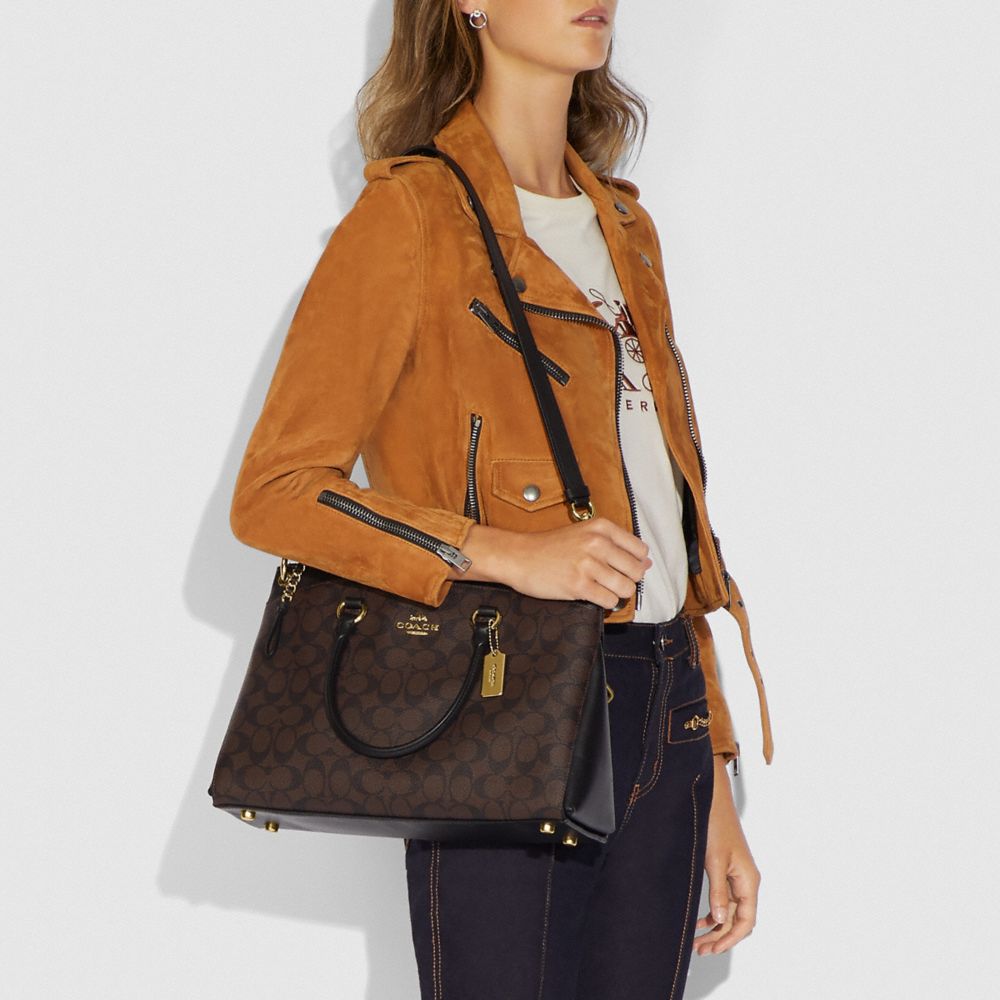 Signature coated canvas with smooth leather details| Inside snap pockets| Zip-top closure, fabric lining| Handles with 8 3/4" drop| Outside slip pockets with magnetic snap closure| Detachable strap with 20" drop for shoulder or crossbody wear| 12 3/4" (L) x 8 3/4" (H) x 5 1/4" (W)