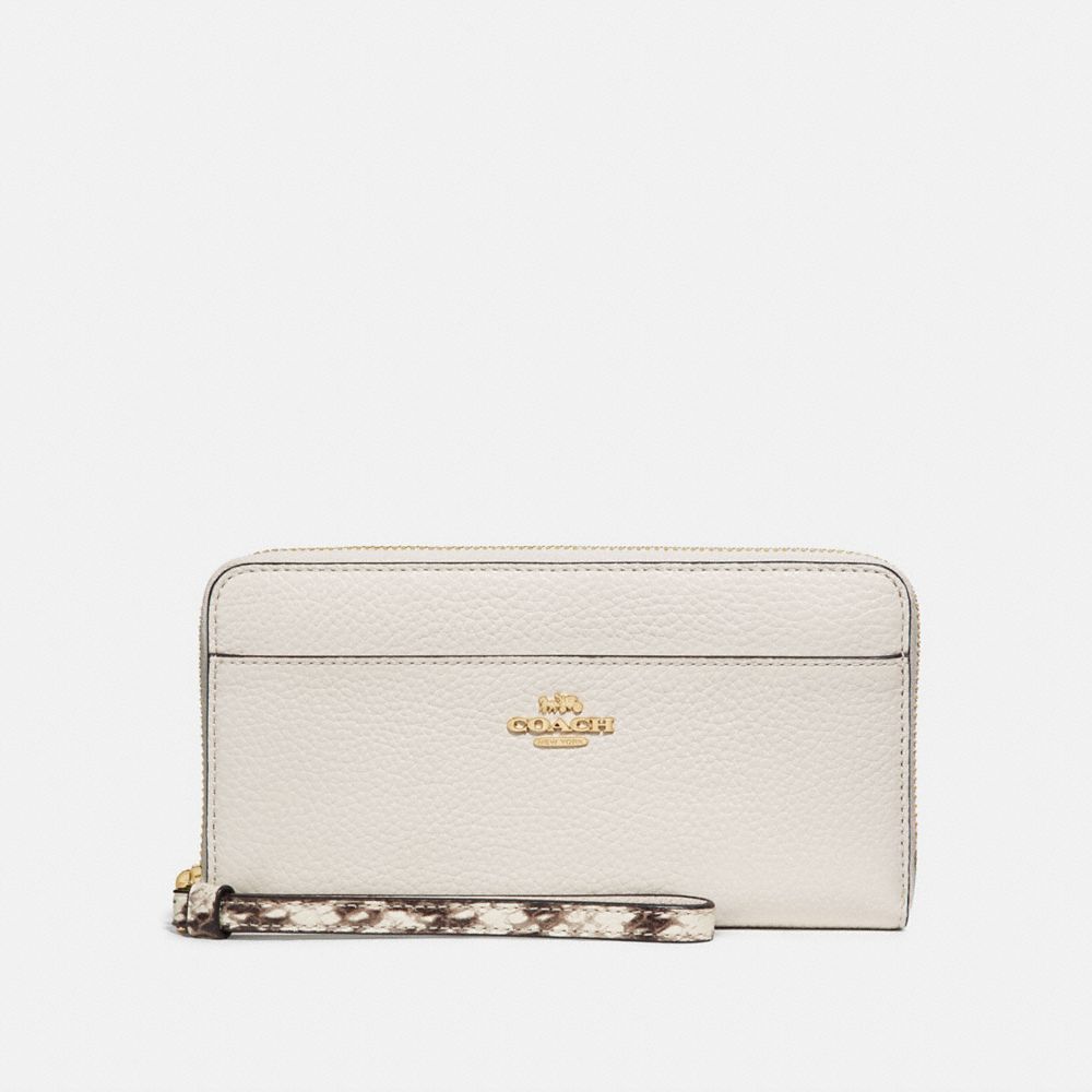Refined pebble leather with snake-embossed leather detail| 12 credit card slots| Full-length bill compartments| Zip coin pocket| Zip-around closure| Outside open pocket| Wrist strap attached| 7 1/2" (L) x 4" (H) x 3/4" (W)| Fits all phone sizes up to an iPhone X and Samsung S7 Edge