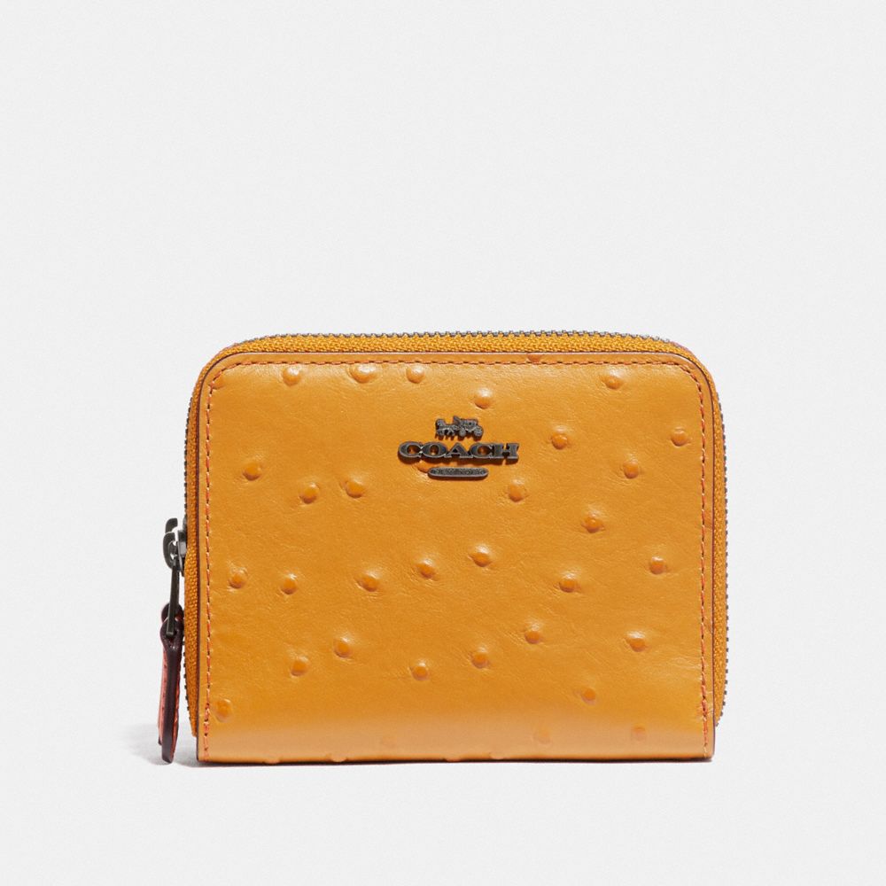 Ostrich-embossed leather| Six credit card slots| Full-length bill compartment| ID window| Snap coin pocket| Double zip closure| 4 1/4" (L) x 3 1/2" (H) x 1 1/4" (W)