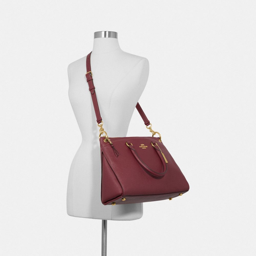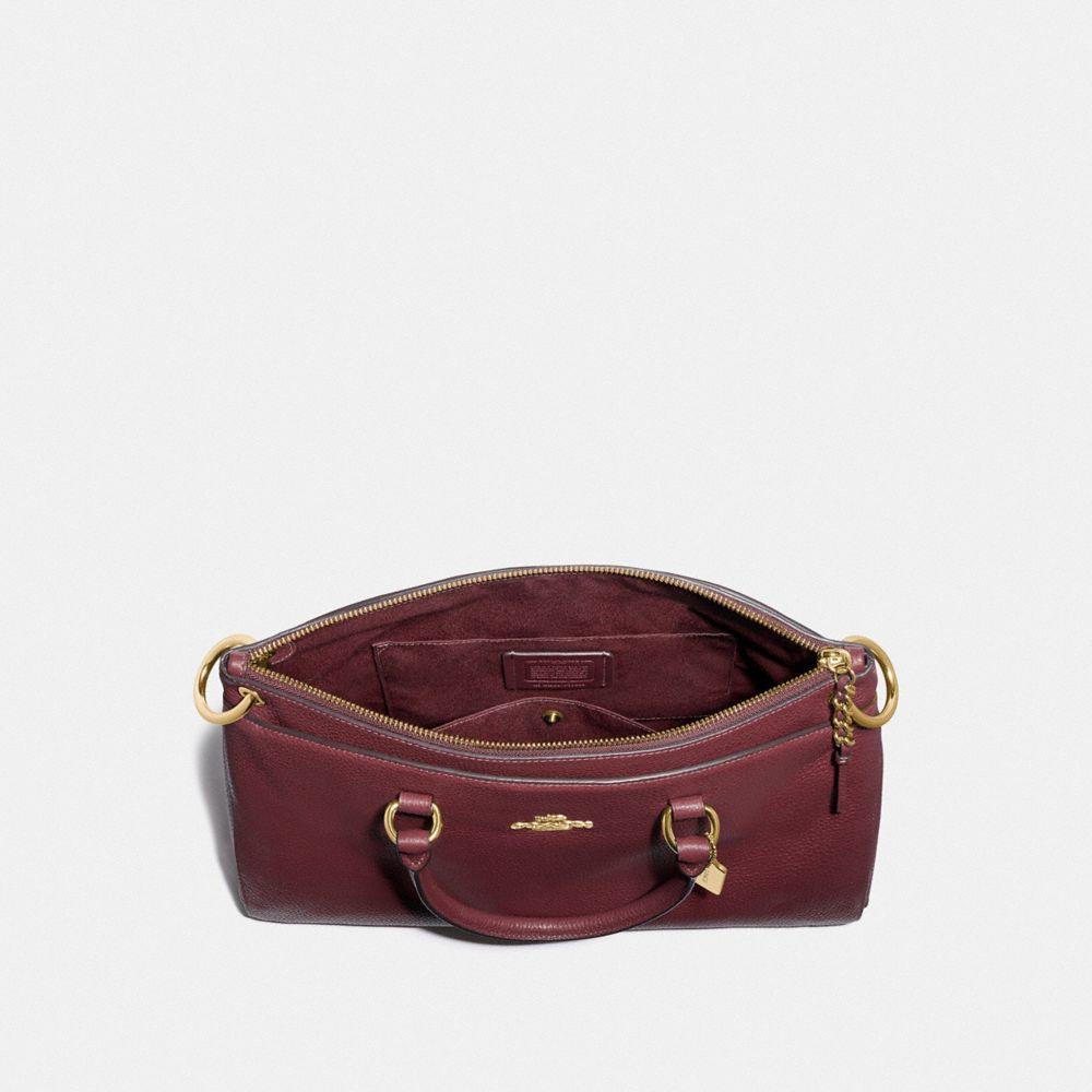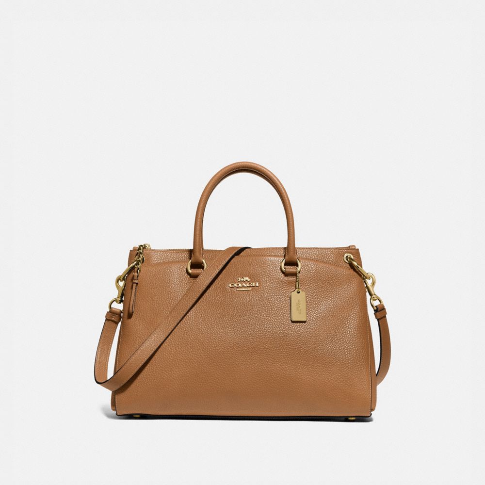 Refined pebble leather| Inside snap pockets| Zip-top closure, fabric lining| Handles with 4 1/4" drop| Outside slip pockets with magnetic snap closure| Detachable strap with 15 1/2" drop for shoulder or crossbody wear| 14 3/4" (L) x 9 1/4" (H) x 5" (W)
