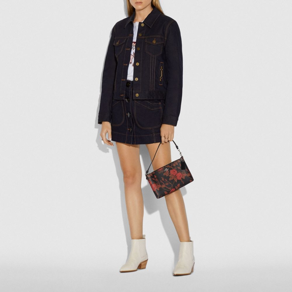 Printed coated canvas with smooth leather details| Six credit card slots| Inside zip and open pocket| Zip-top closure, fabric lining| Strap with clip to form a wrist strap or attach to the inside of a bag| 9 3/4" (L) x 6" (H) x 1 1/4" (W)