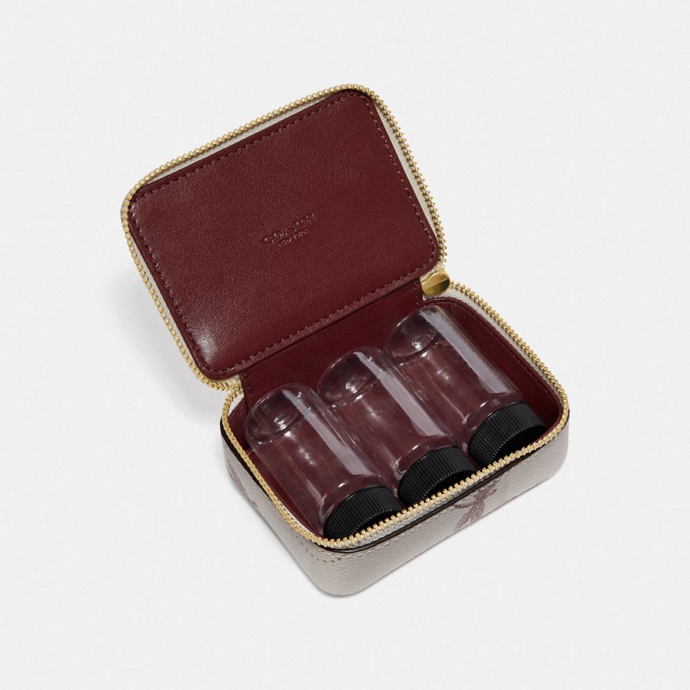 Printed coated canvas| Zip-around closure| 3 1/2" (L) x 2 1/2" (H) x 1 1/2" (W)| Includes three pill bottles
