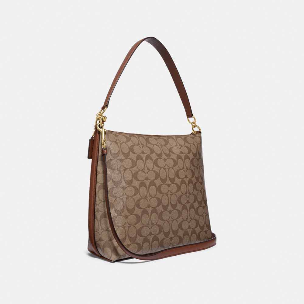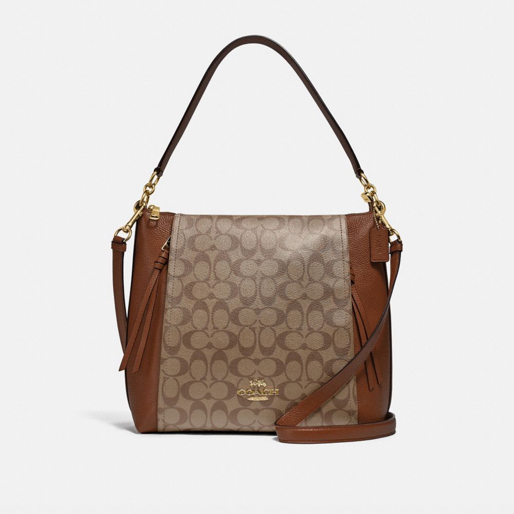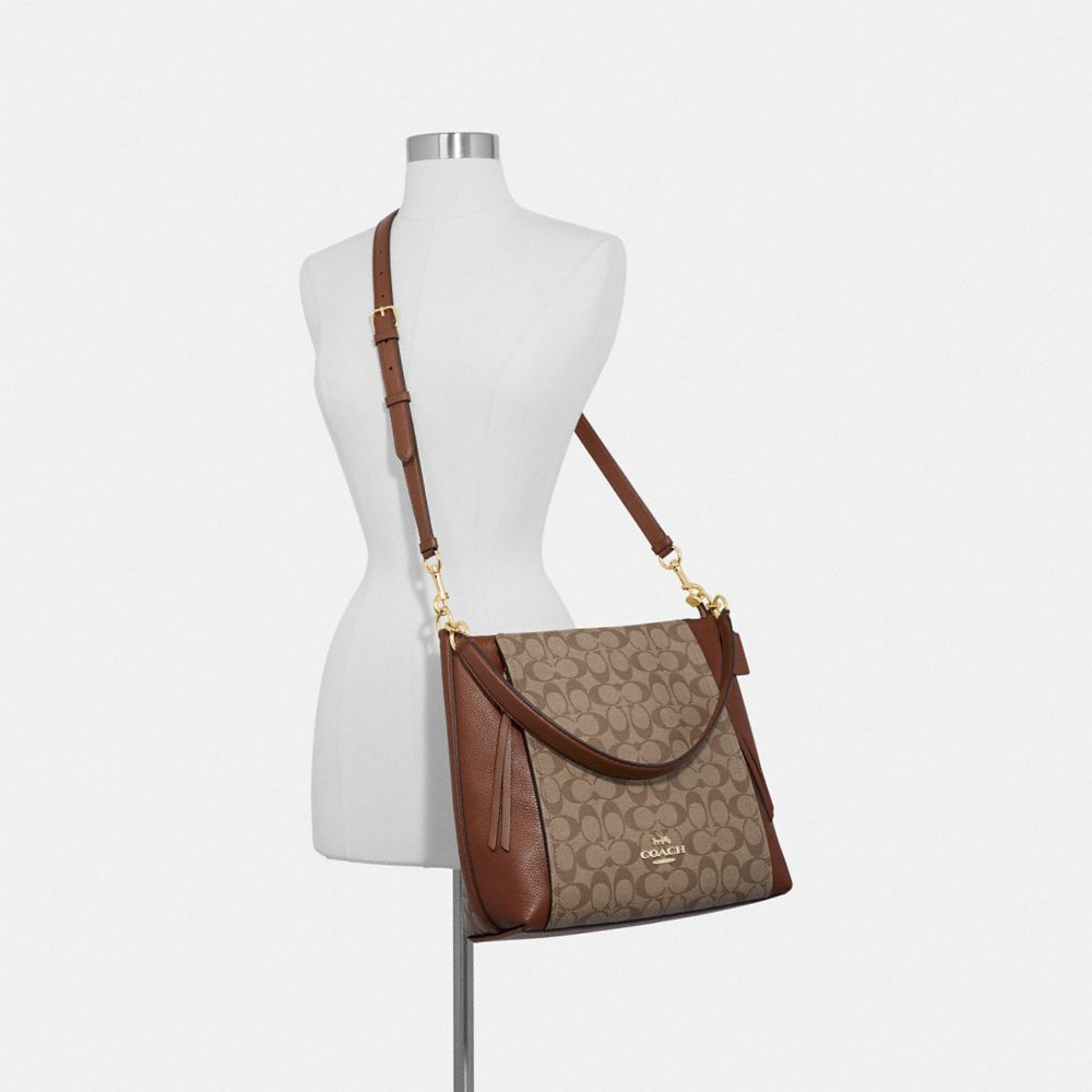 Signature coated canvas and refined pebble leather| Inside zip pocket| Zip-top closure, fabric lining| Handle with 9" drop| Outside zip pockets| Detachable strap with 20" drop for shoulder or crossbody wear| 12 3/4" (L) x 11 1/4" (H) x 4 1/2" (W)