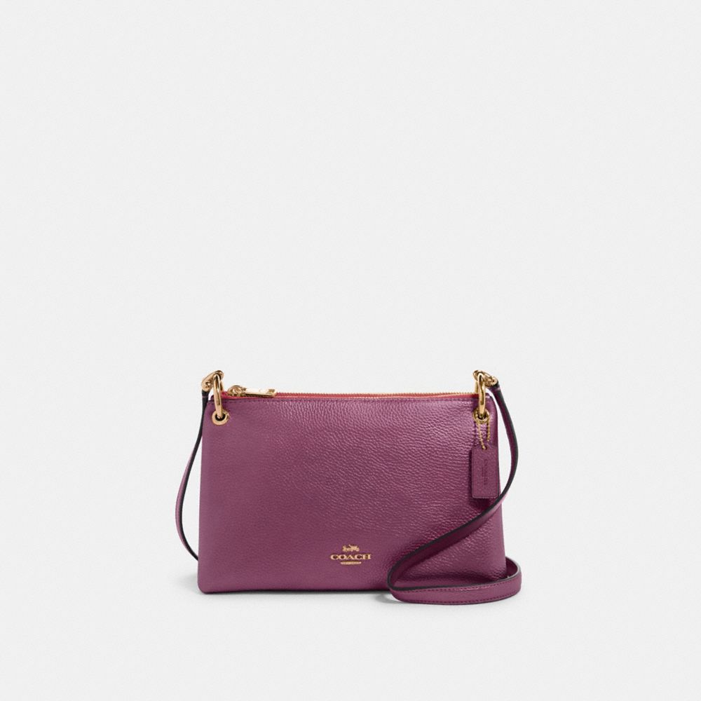 Metallic refined pebble leather| Two credit card slots| Inside multifunction pocket| Center snap compartment| Double zip closure, fabric lining| Adjustable strap with 22 3/4" drop for shoulder or crossbody wear| 9 3/4" (L) x 6 3/4" (H) x 2 3/4" (W)