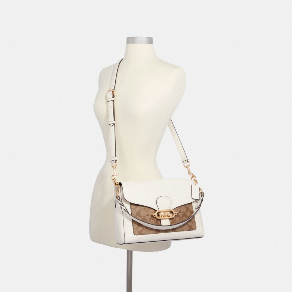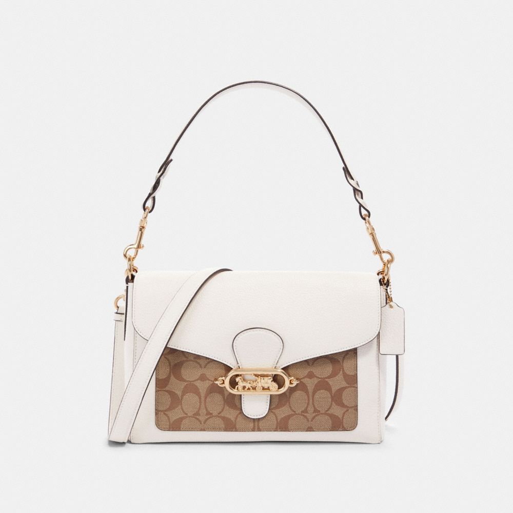 Refined pebble leather and Signature coated canvas| Inside multifunction pockets| Magnetic snap closure, fabric lining| Detachable handle with 8 1/4" drop| Outside zip pocket| Detachable strap with 18" drop for shoulder or crossbody wear| 11 1/2" (L) x 7 3/4" (H) x 3 1/2" (W)