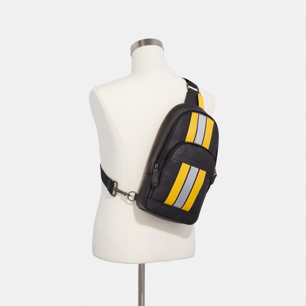 Smooth calf leather with mirror patent leather details| Inside tech sleeve| Zip closure, fabric lining| Adjustable strap for crossbody wear| Outside zip pocket| 7 3/4" (L) x 14 3/4" (H) x 2 1/2" (W)