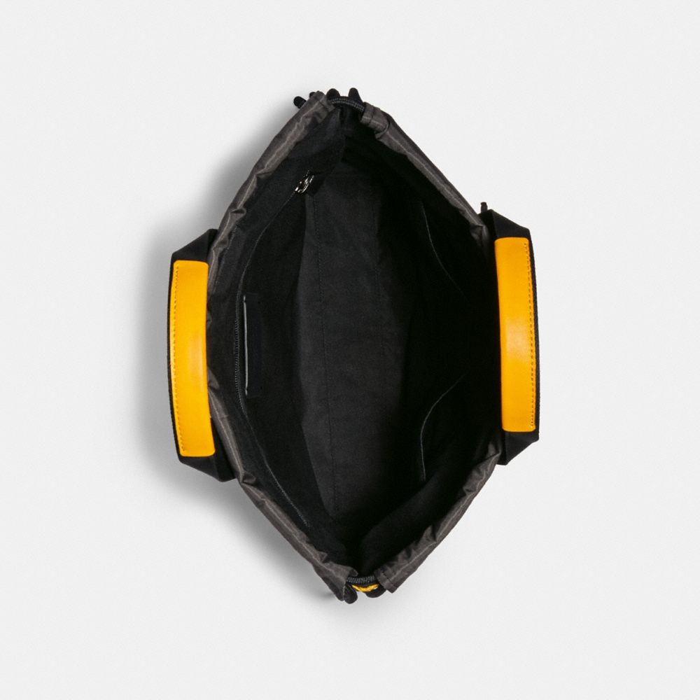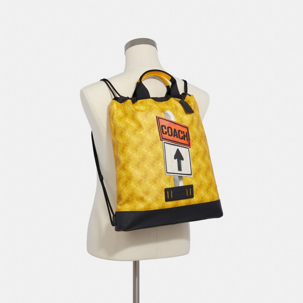 Printed coated canvas, smooth calf leather and nylon| Inside zip, cell phone and multifunction pockets| Drawstring closure, fabric lining| Handles with 4 1/4" drop| Outside zip pocket| 13 3/4" (L) x 15 3/4" (H) x 2" (W)| Featuring the graphics of artist and graphic designer Jay Shells