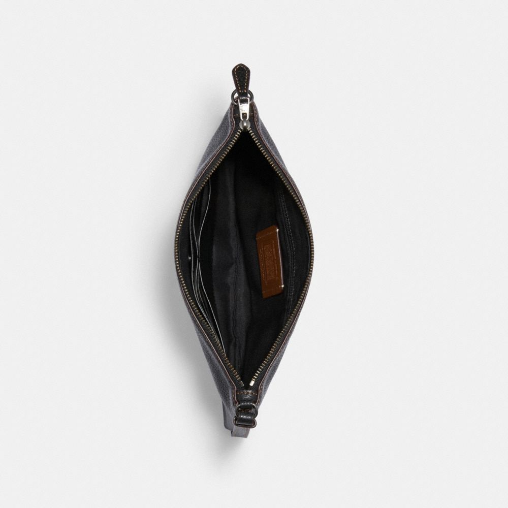 Polished pebble leather| Six credit card slots| Inside zip and open pocket| Zip-top closure, fabric lining| Strap with clip to form a wrist strap or attach to the inside of a bag| 9 3/4" (L) x 6" (H) x 1 1/4" (W)