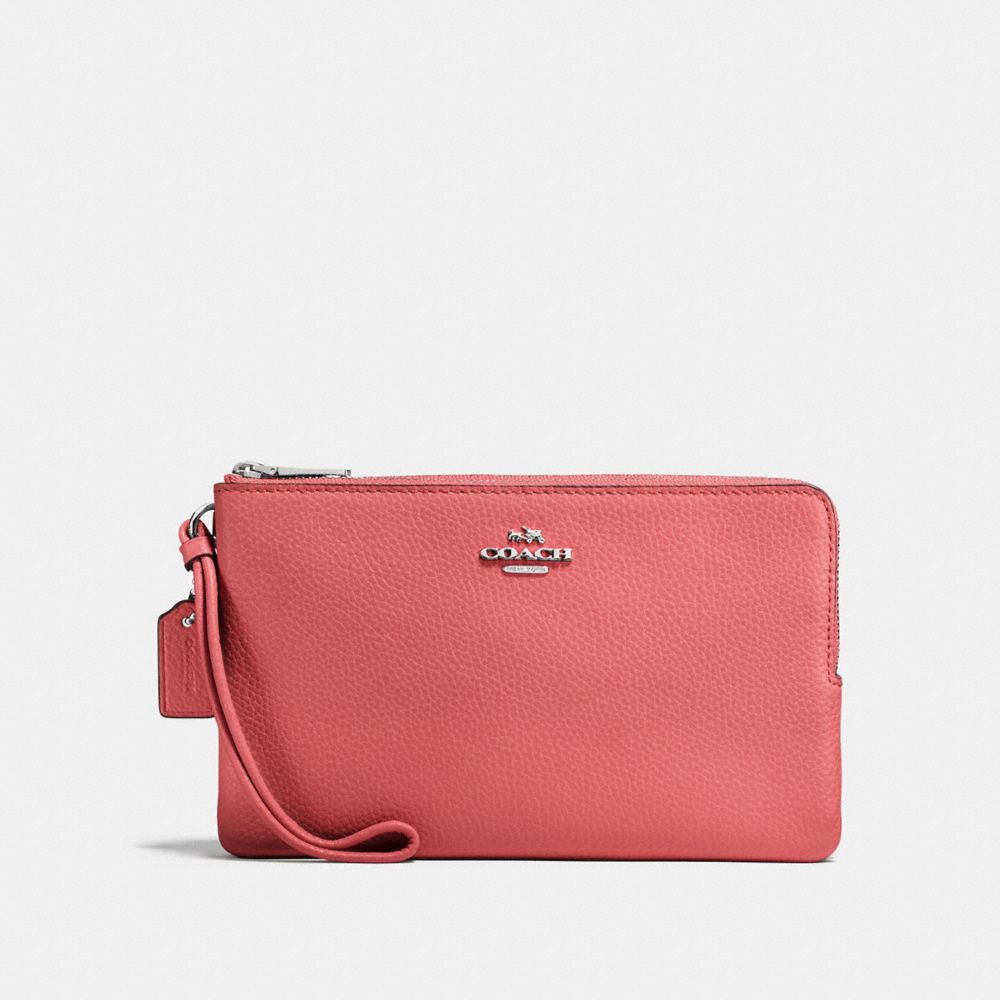 | Polished pebble leather| Six credit card slots| Full-length bill compartment| Inside open pockets| Double zip closure, fabric lining| Wrist strap attached| 8" (L) x 4 3/4" (H) x 1 1/4"| Fits all phone sizes up to an iPhone X and Samsung S7 Edge