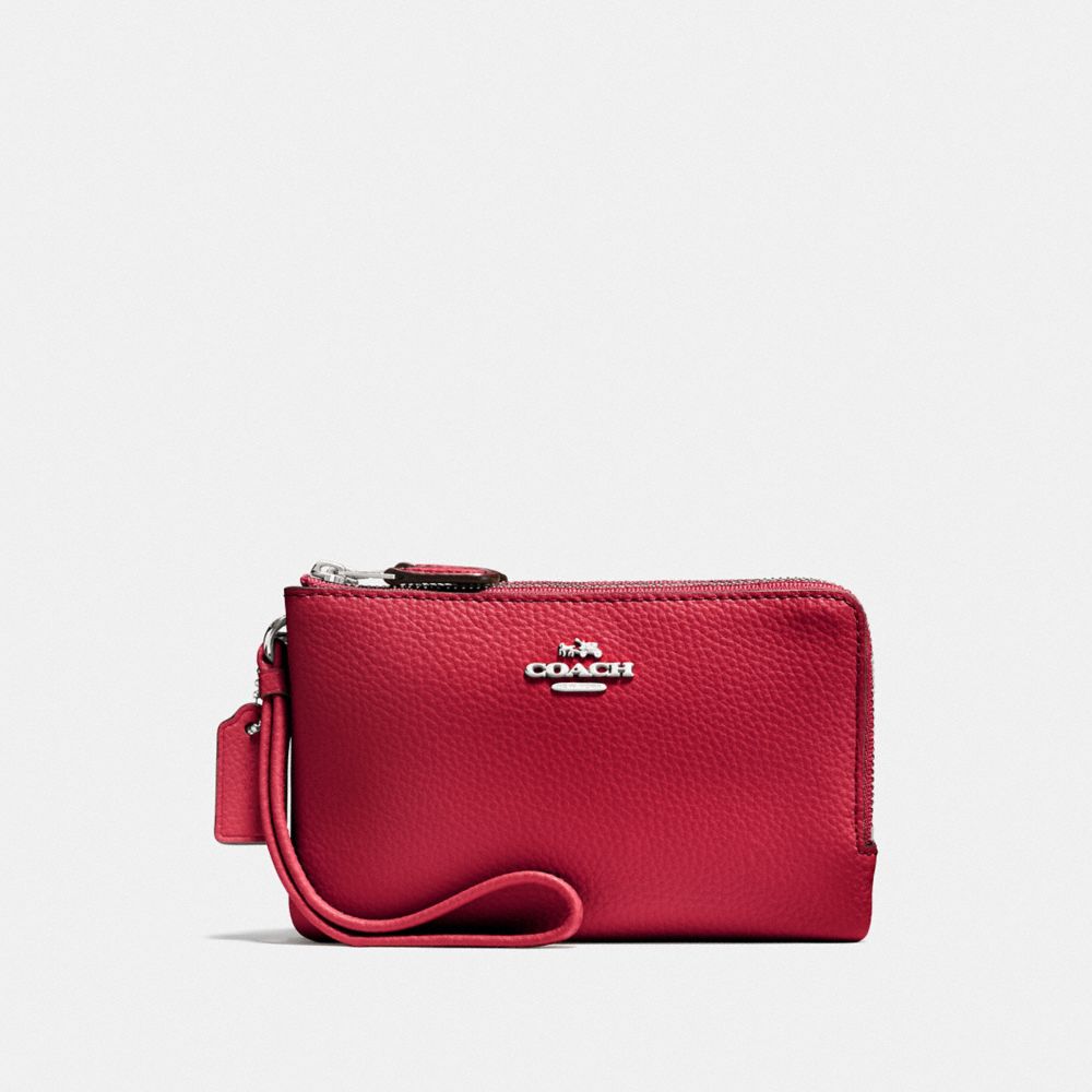 Polished pebble leather| Two credit card slots| Double zip closure, fabric lining| Wrist strap attached| 6 1/2" (L) x 3 3/4" (H) | Fits an iPhone or Android