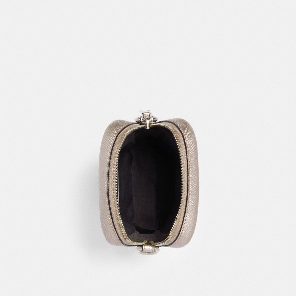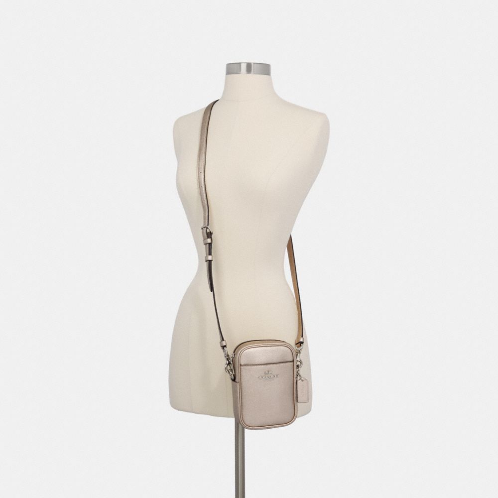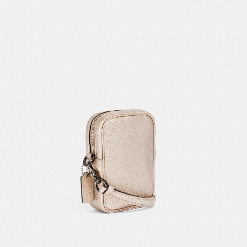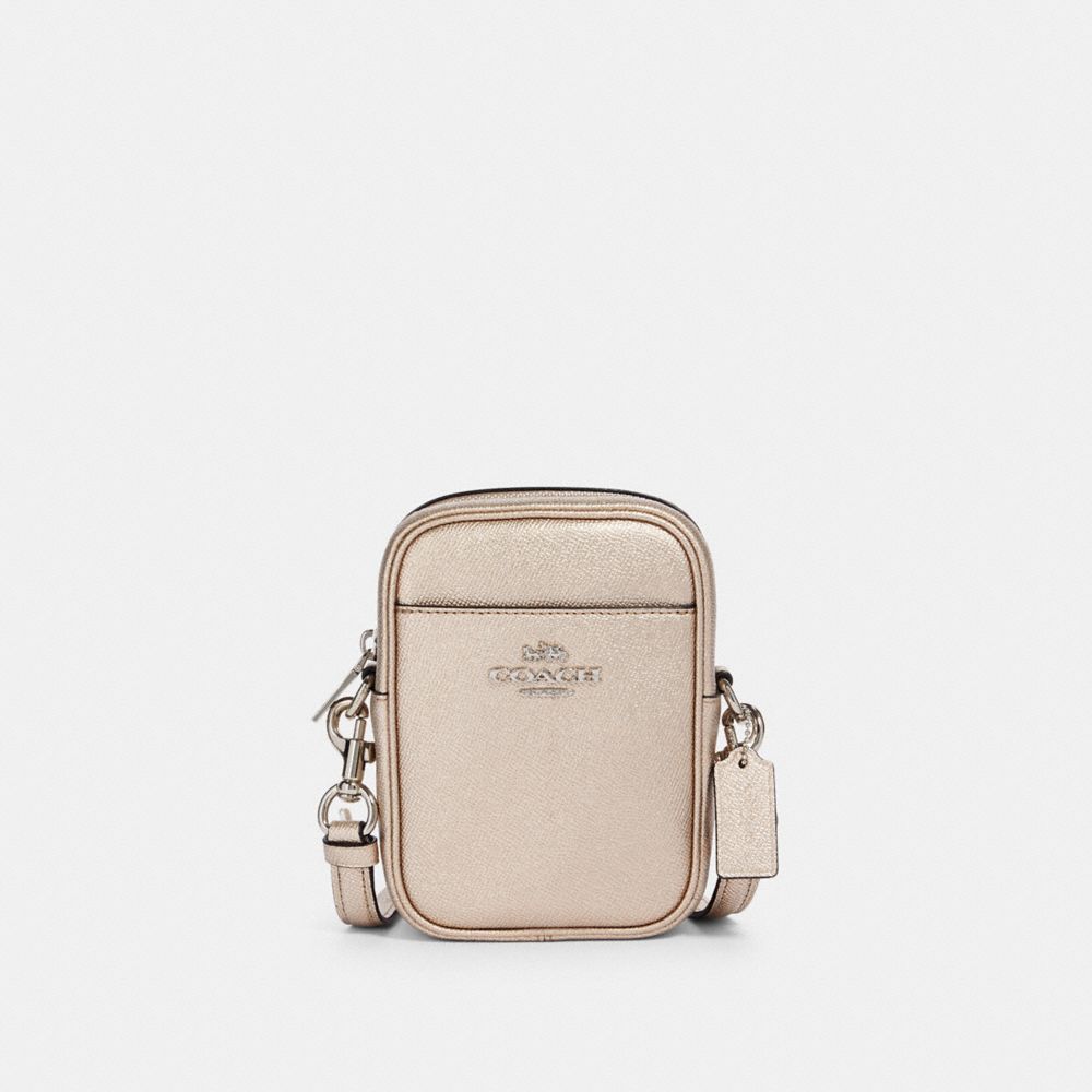 Metallic crossgrain leather| Zip closure, fabric lining| Outside slip pocket| Detachable strap with 22" drop for shoulder or crossbody wear| 5" (L) x 6 3/4" (H) x 2" (W)