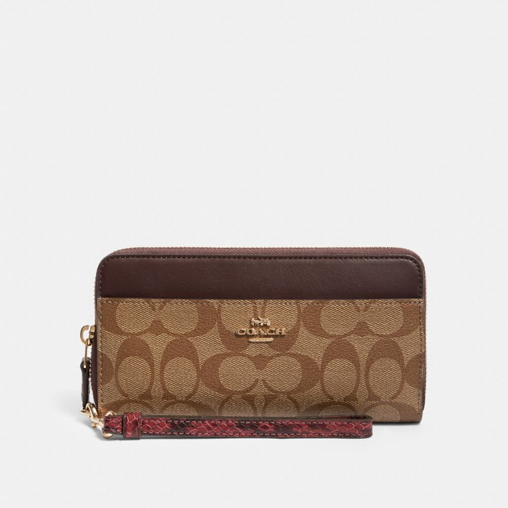 Signature coated canvas, smooth leather and snake-embossed leather| 12 credit card slots| Full-length bill compartments| Zip coin pocket| Zip-around closure| Outside open pocket| Detachable wrist strap| 7 1/2" (L) x 4" (H) x 3/4" (W)| Fits all phone sizes up to an iPhone X and Samsung S7 Edge