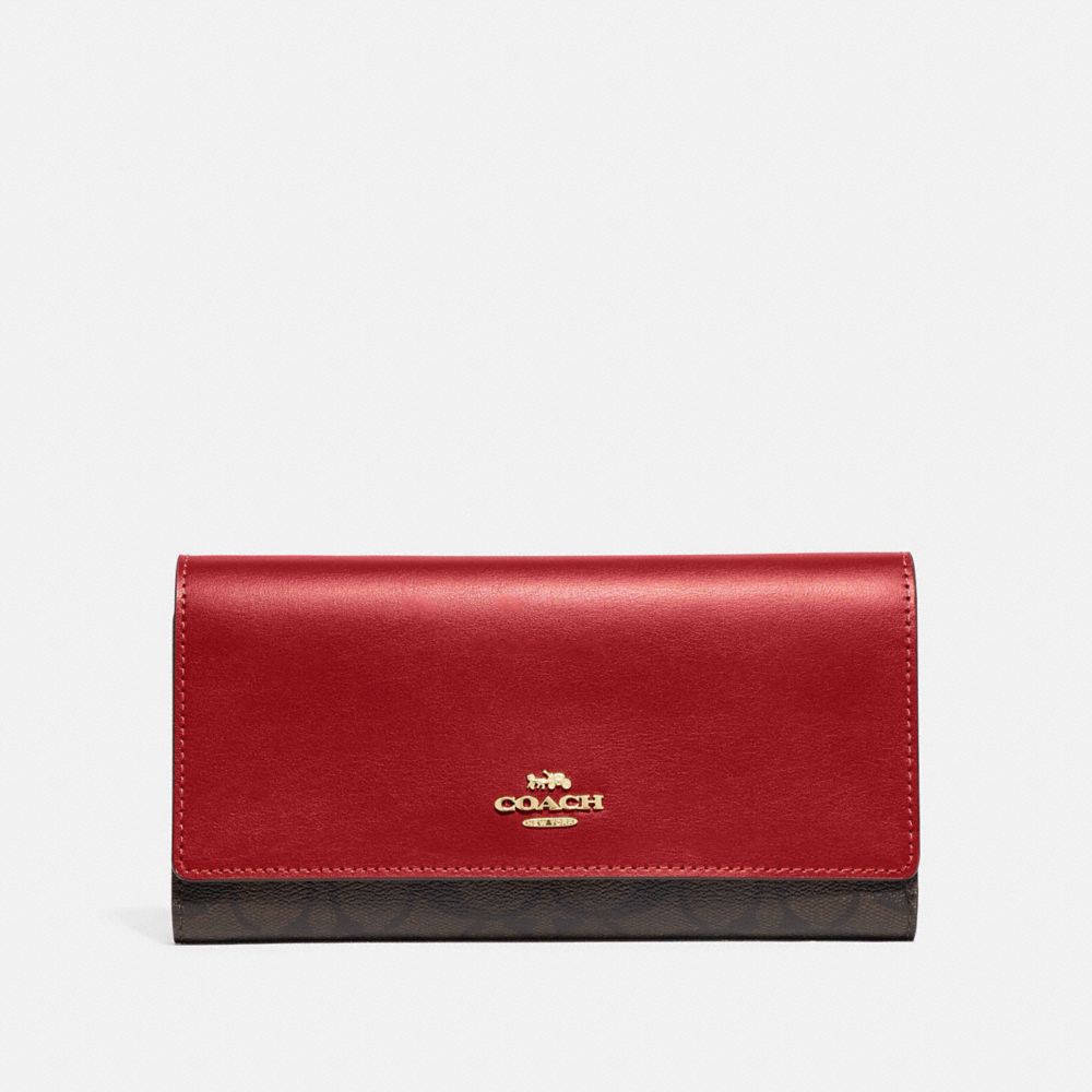 Signature coated canvas and smooth leather| Ten credit card slots| Full-length bill compartment| Zip coin pocket| Snap closure| ID window| 7 3/4" (L) x 4 1/4" (H)