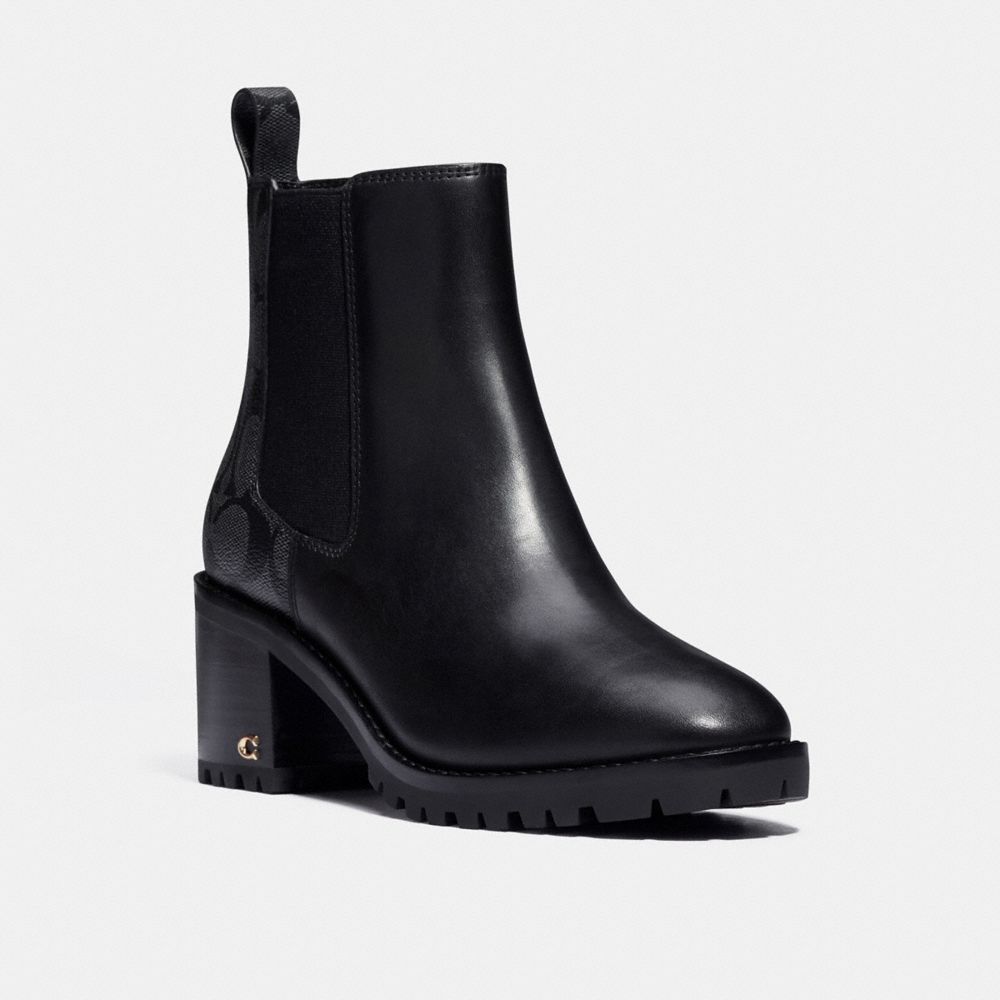 Leather and Signature coated canvas upper| Man-made leather lining and footbed| Rubber outsole| Pull on| Shaft: 4 3/4" height, 10" circumference| 2 1/2" heel