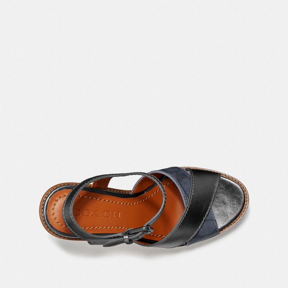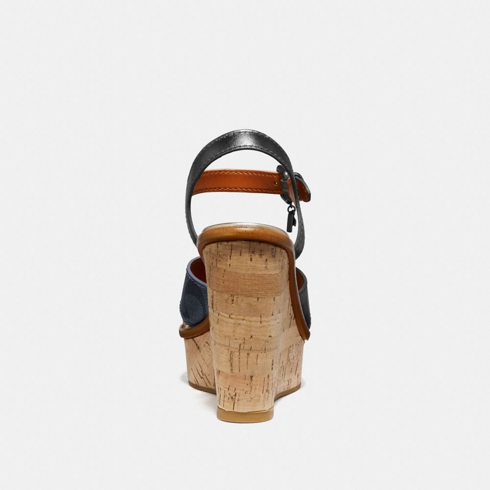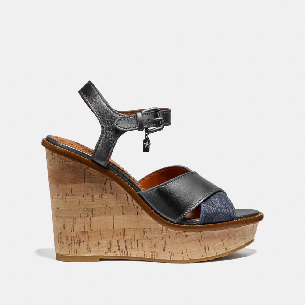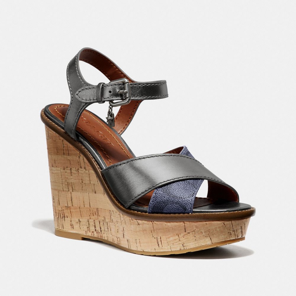 Signature coated canvas and leather upper| Man-made leather lining and footbed| Rubber outsole| Buckle closure| 4 1/4" heel, 1 1/2" platform