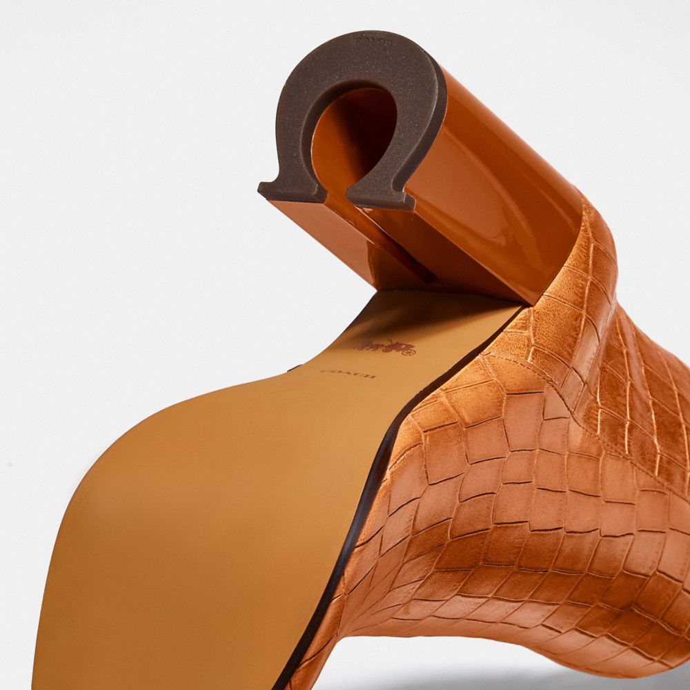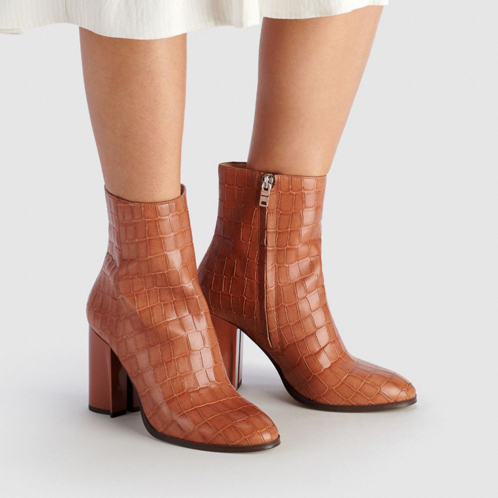 Crocodile-embossed leather upper| Man-made leather lining and footbed| Rubber outsole| Zip closure| Shaft: 5" height, 9 3/4" circumference| 3 1/2" heel