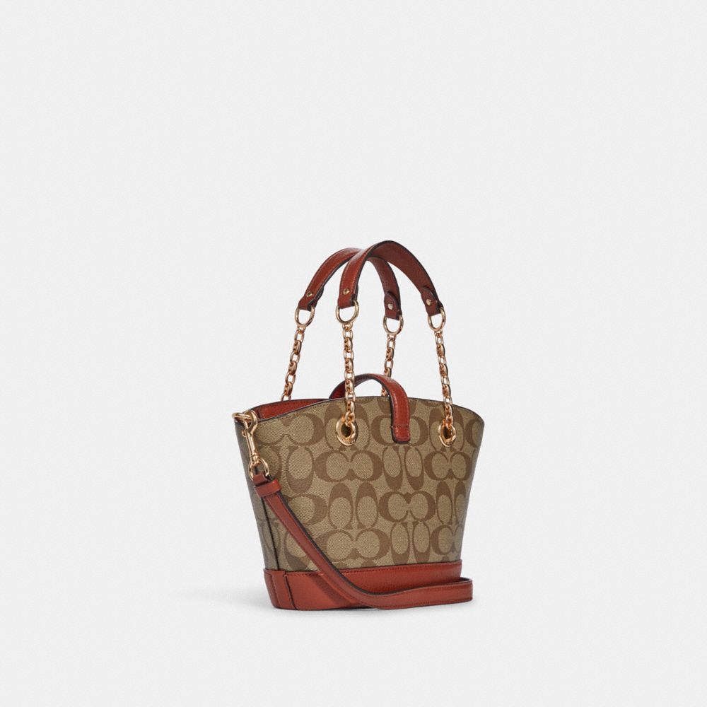 Signature coated canvas and refined pebble leather| Inside zip and multifunction pockets| Zip-top and turnlock closures, fabric lining| Handles with 5" drop| Detachable strap with 21" drop for shoulder or crossbody wear| 7" (L) x 6 3/4" (H) x 4" (W)Style No. C8597