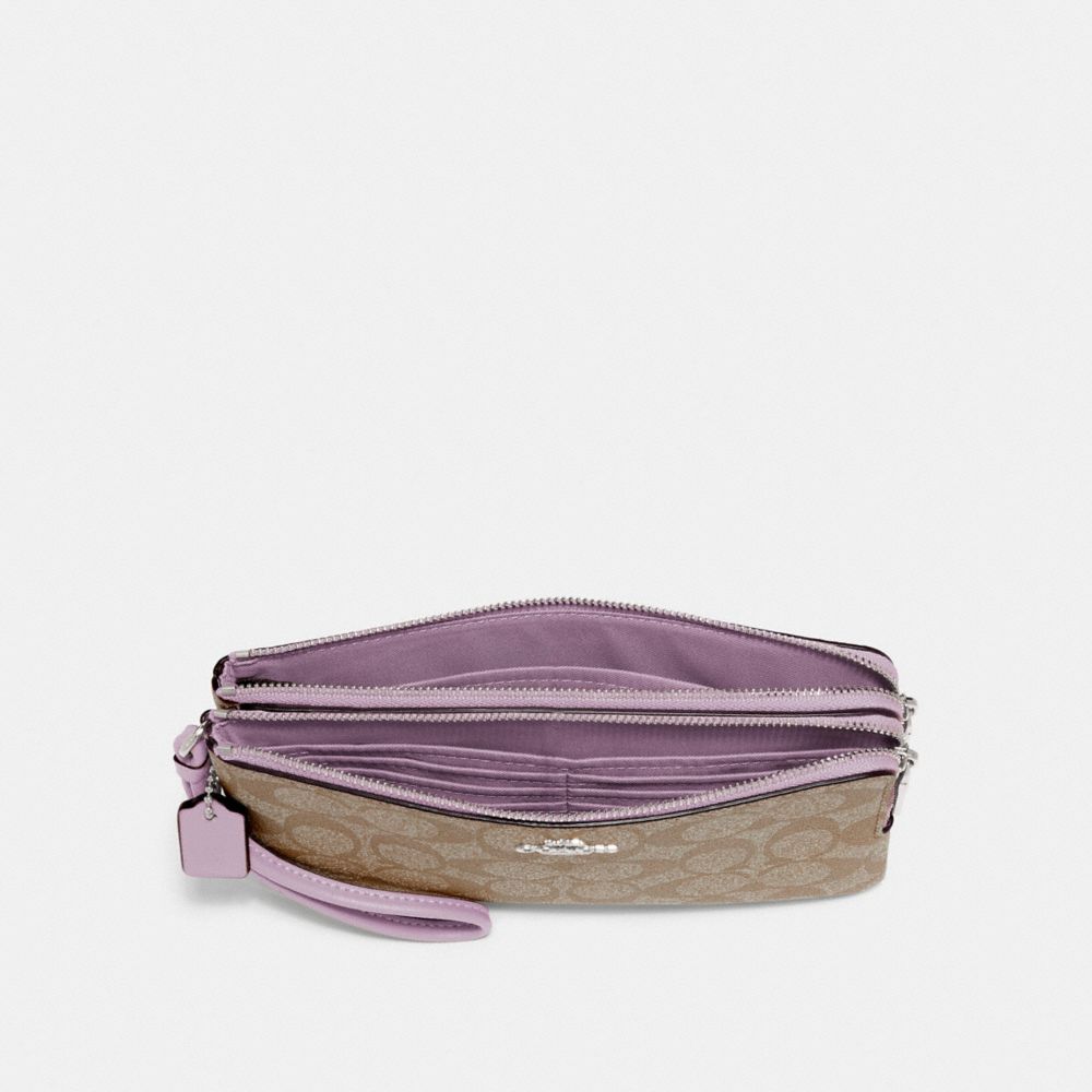 Signature coated canvas| Six credit card slots| Full-length bill compartment| Inside open pockets| Double zip closure, fabric lining| Wrist strap attached| 8" (L) x 4 3/4" (H) x 1 1/4"| Fits all phone sizes up to an iPhone X and Samsung S7 Edge