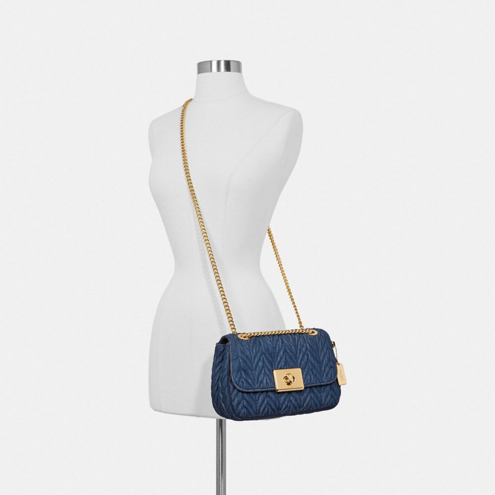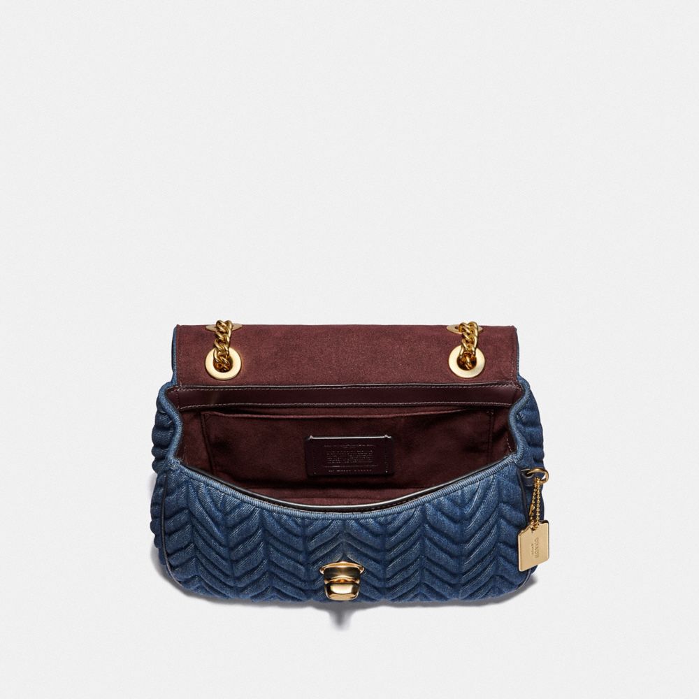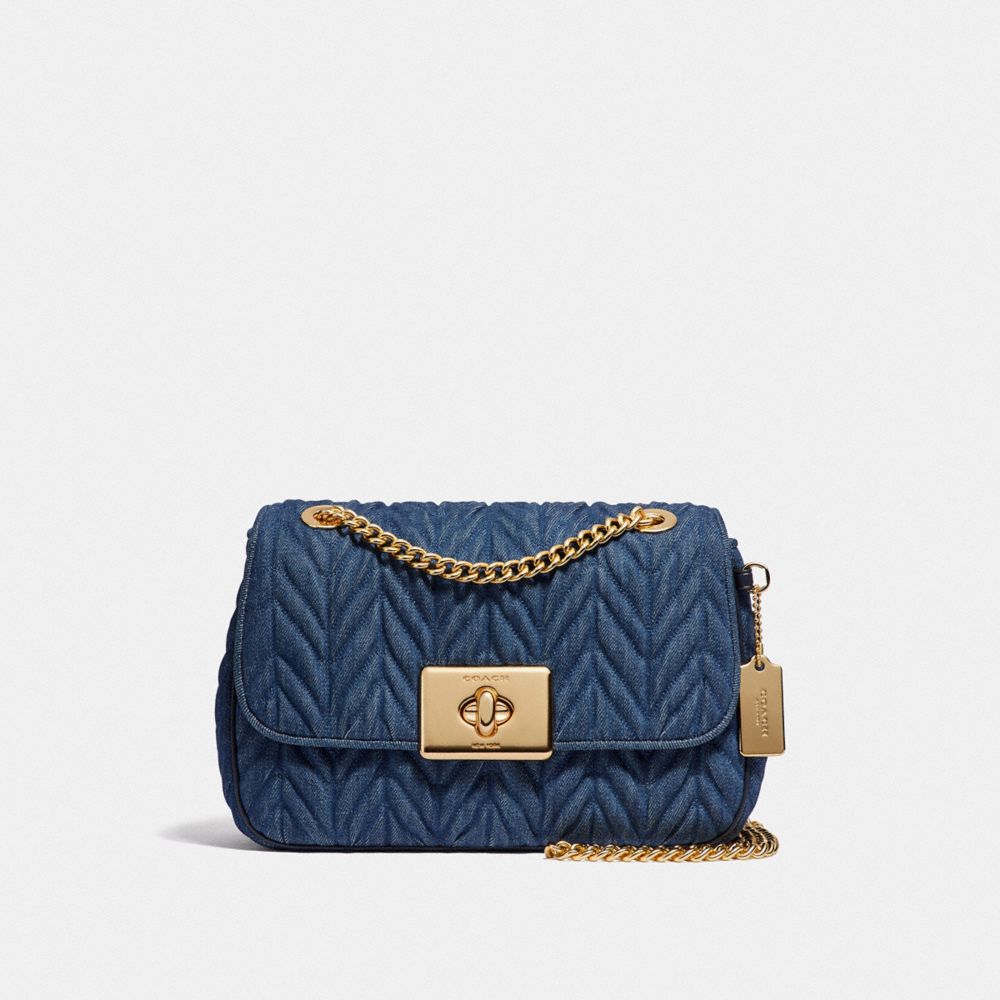 | Denim with smooth leather details| Inside multifunction pockets| Turnlock closure, fabric lining| Handles convert to shoulder strap with 22 1/2" drop| Outside slip pocket| 9 1/2" (L) x 6 1/4" (H) x 3 1/4" (W)