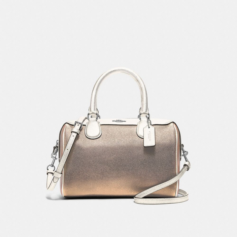 | Metallic crossgrain leather| Inside zip and multifunction pockets| Zip-top closure, fabric lining| Handles with 4" drop| Detachable strap with 23" drop for shoulder or crossbody wear| 9" (L) x 6 1/2" (H) x 5" (W)
