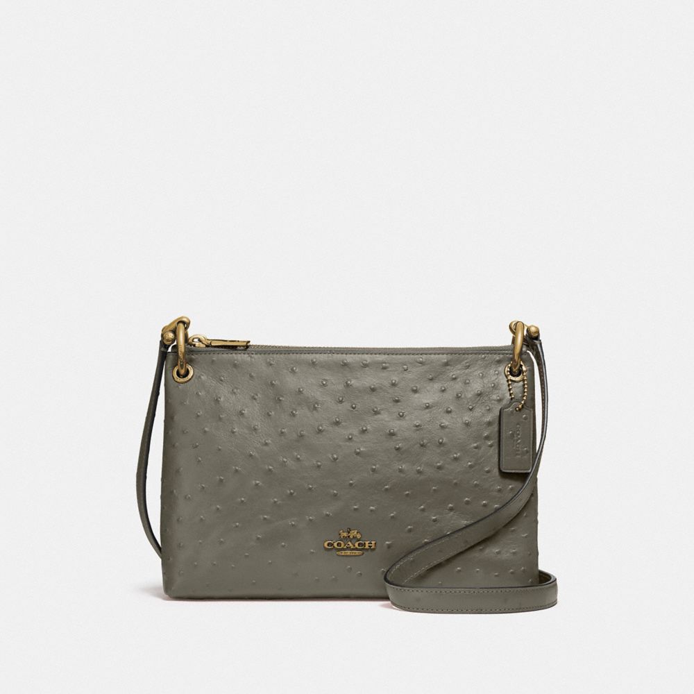 Ostrich-embossed leather| Two credit card slots| Inside multifunction pocket| Center snap compartment| Double zip closure, fabric lining| Adjustable strap with 22 3/4" drop for shoulder or crossbody wear| 9 3/4" (L) x 6 3/4" (H) x 2 3/4" (W)