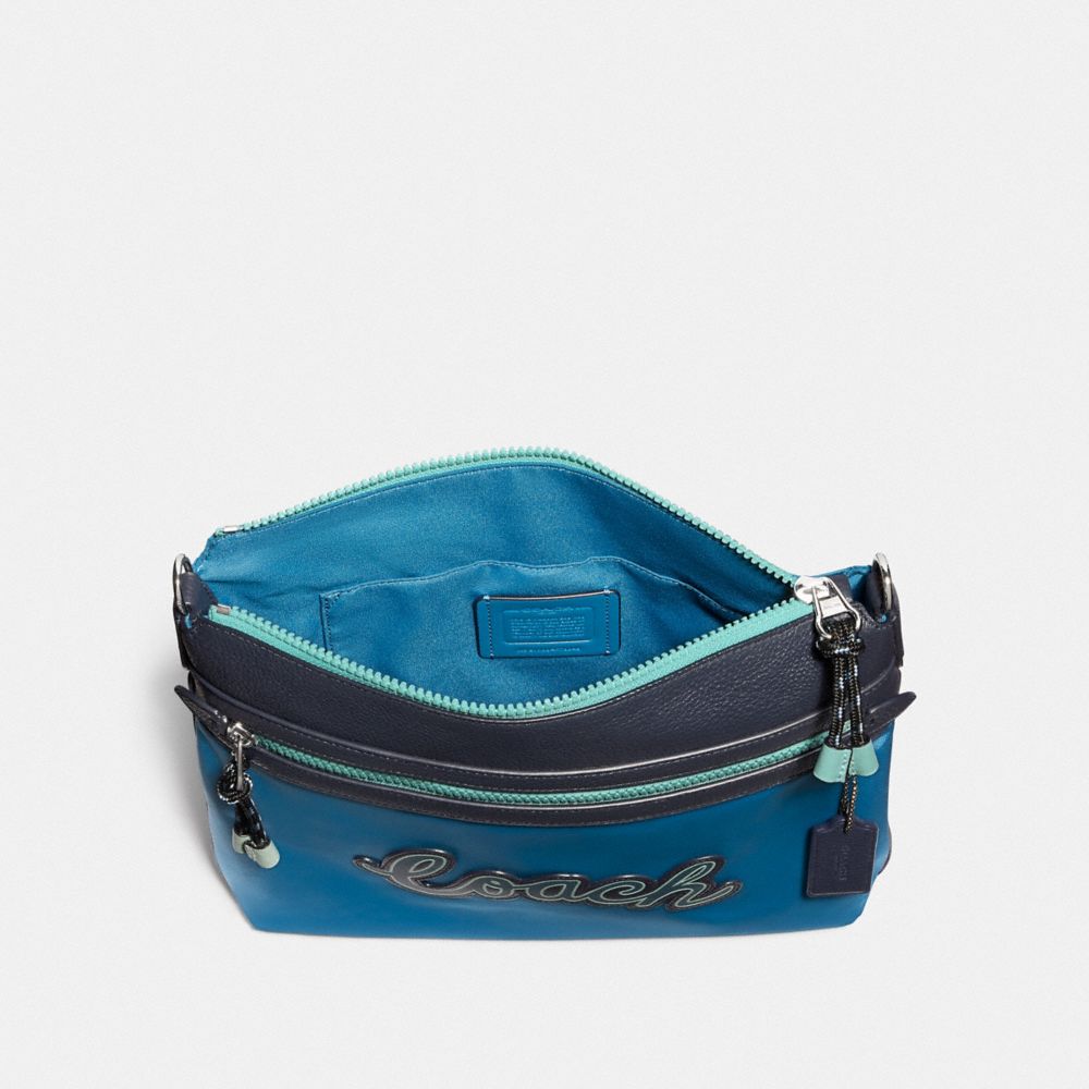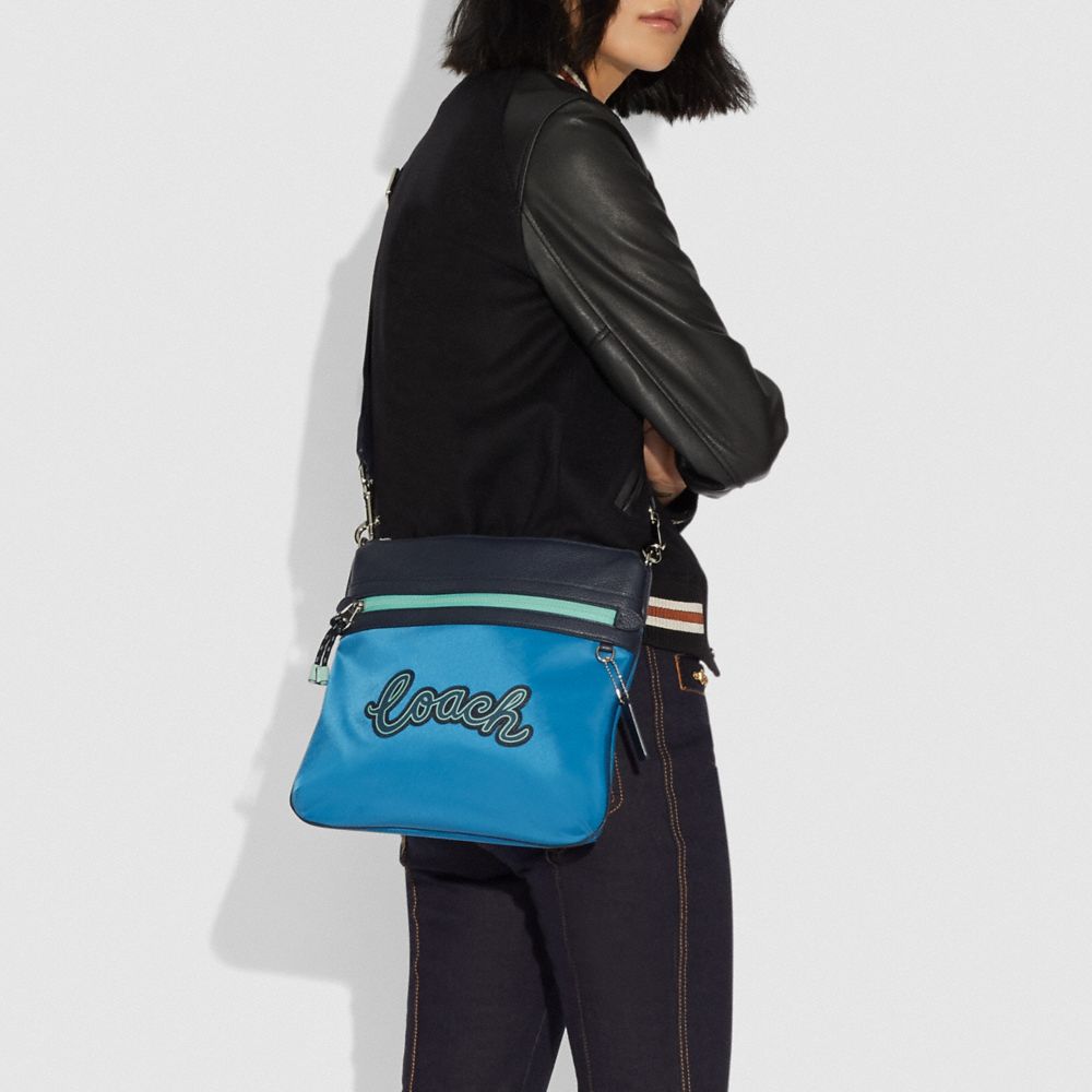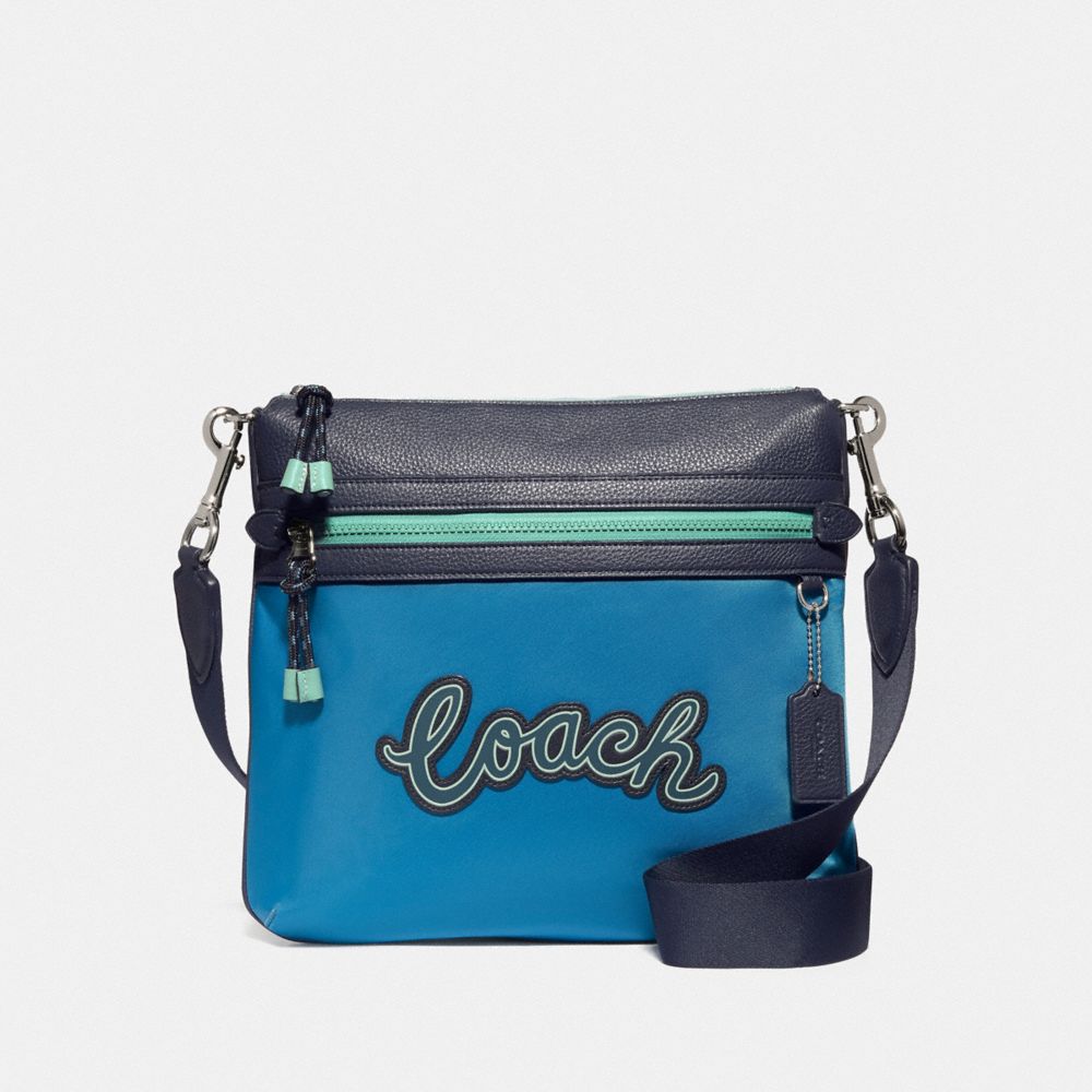 Nylon and refined pebble leather| Inside snap pocket| Zip-top closure, fabric lining| Outside zip pocket| Detachable strap with 16 1/2" drop for shoulder or crossbody wear| 11 1/2" (L) x 10 1/2" (H) x 2 3/4" (W)