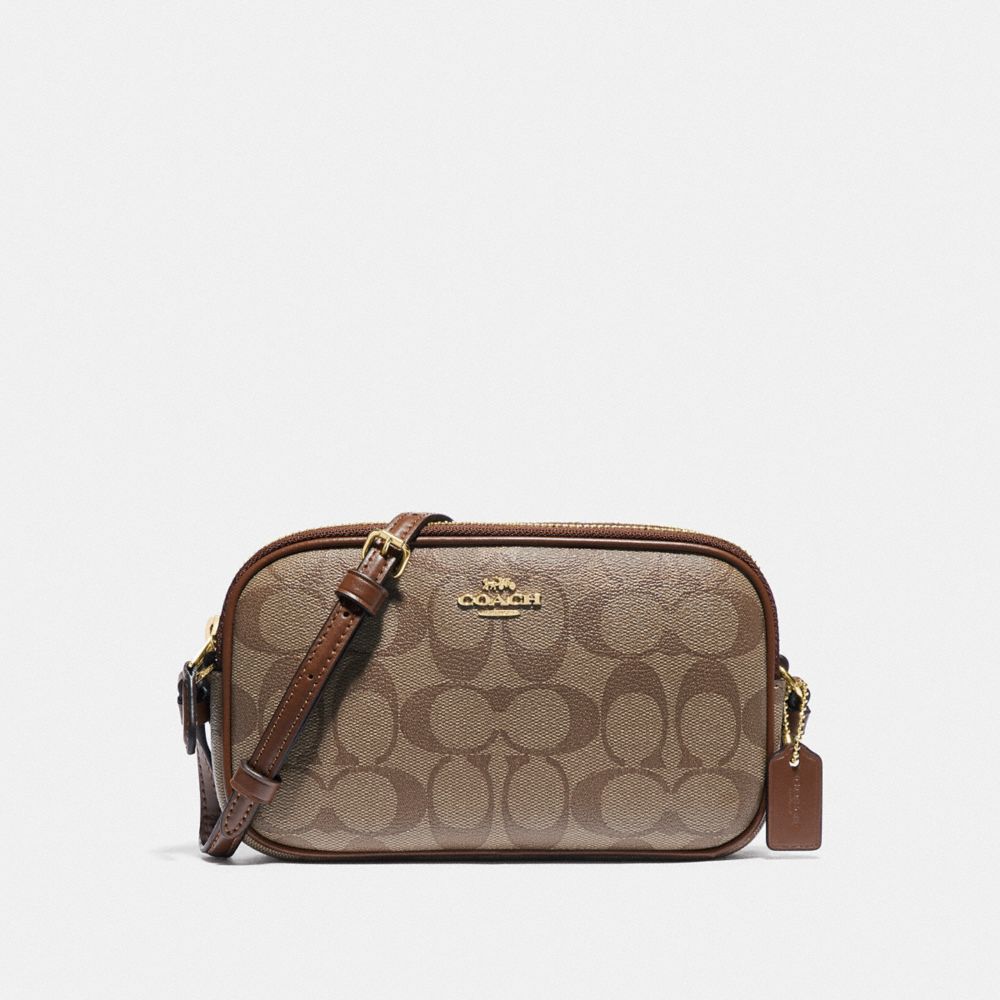 Signature coated canvas| Two credit card slots| Inside multifunction pocket| Double zip closure, fabric lining| Adjustable strap with 23" drop for shoulder or crossbody wear| 7 1/2" (L) x 4 1/2" (H) x 1 1/2" (W)