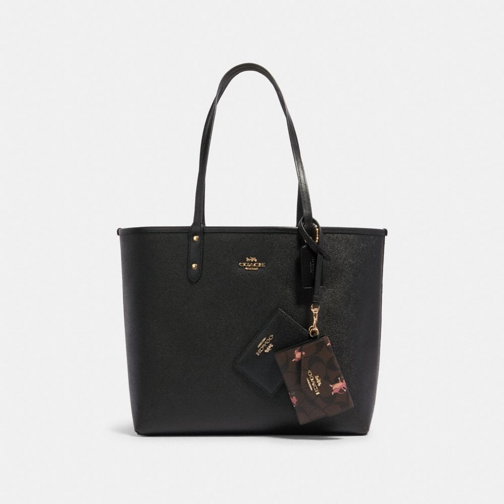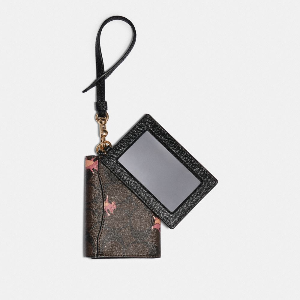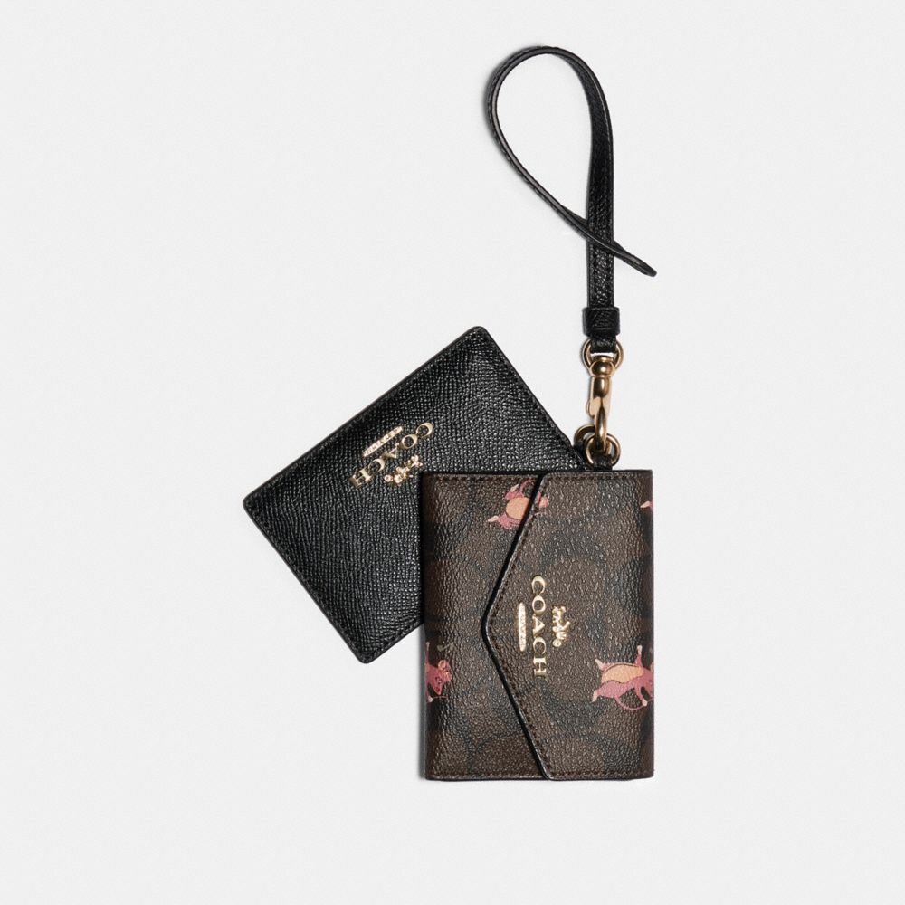 Trifold pouch:| Signature coated canvas| Four credit card slots| Snap closure| Outside slip pocket| 4" (L) x 3" (H)| Mirror case:| Crossgrain leather| 4" (L) x 2 3/4" (H)| Detachable lanyard with 6" drop