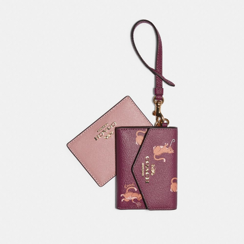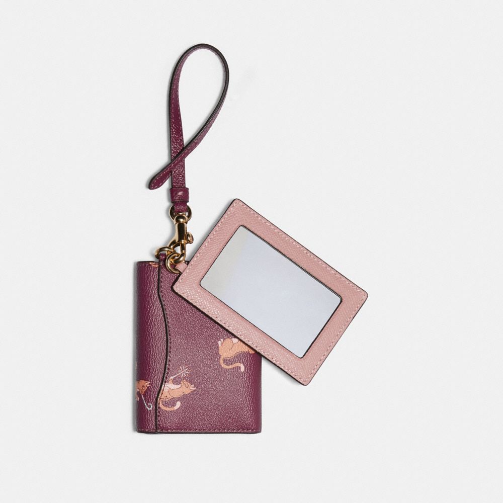 Trifold pouch:| Printed coated canvas| Four credit card slots| Snap closure| Outside slip pocket| 4" (L) x 3" (H)| Mirror case:| Crossgrain leather| 4" (L) x 2 3/4" (H)| Detachable lanyard with 6" drop