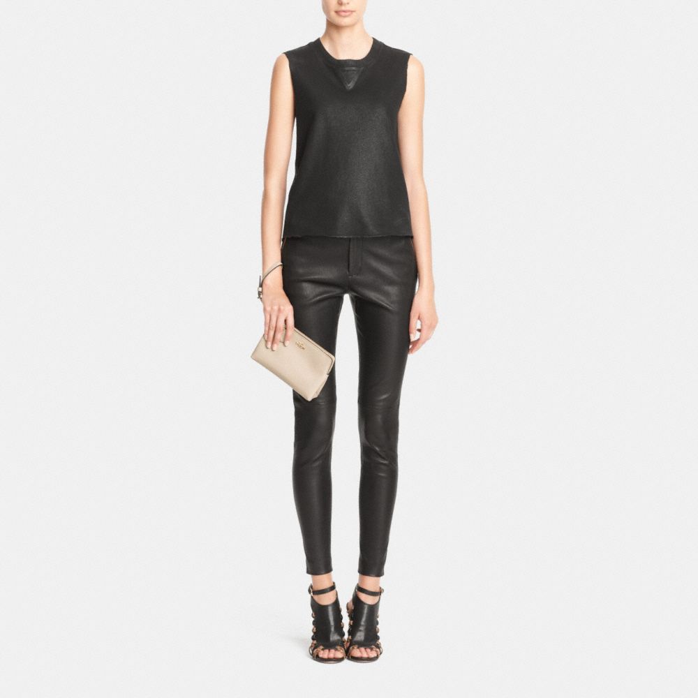 Details| | | Leather| Three credit card pockets and open multifunction pocket| Zip-top closure, fabric lining| Wrist strap attached| 7 3/4" (L) x 5" (H) x 2 1/4" (W)