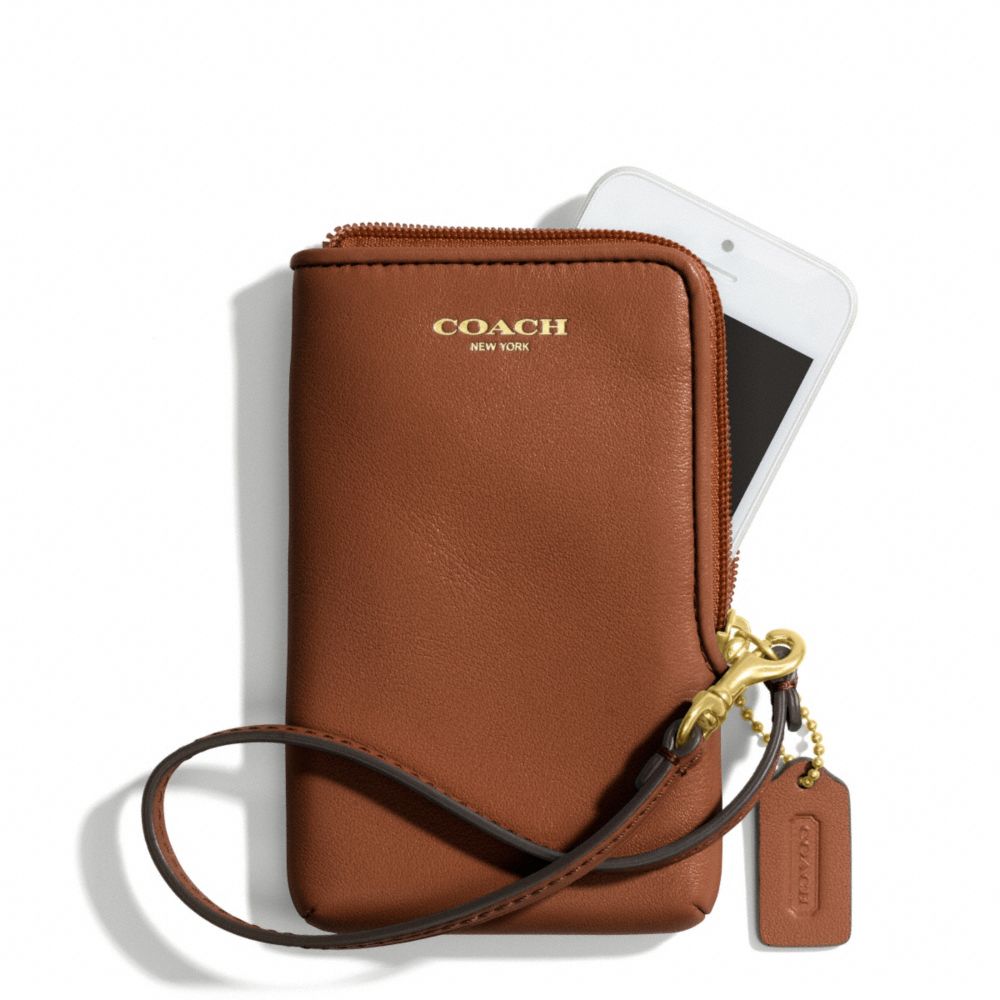 Details| | | Leather Inside multifunction pockets Outside open pocket Zip-top closure Strap with clip to form a wrist strap or attach to the inside of a bag For use with cell phones, smart phones and MP3 players 3 1/2 (L) x 5 1/4 (H) x 3/4 (W)