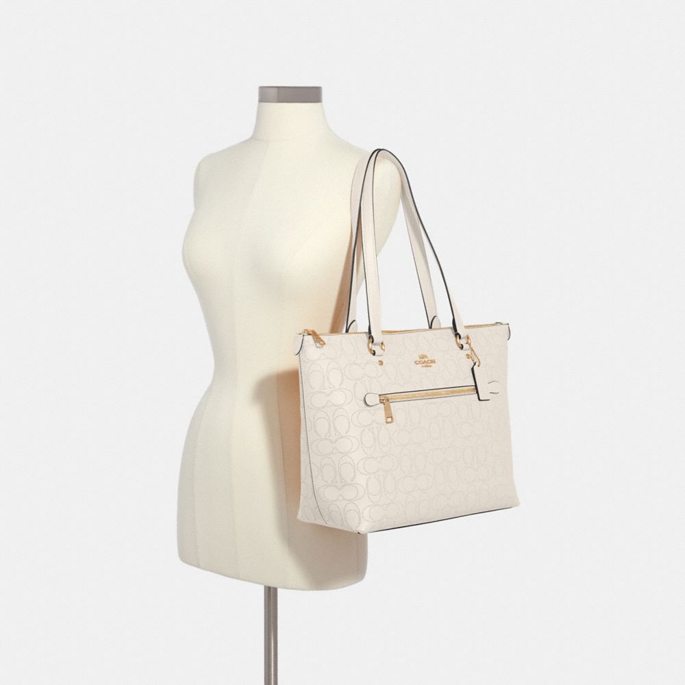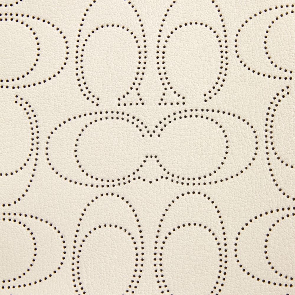 Signature perforated leather and smooth leather| Inside zip, cell phone and multifunction pockets| Zip-top closure, fabric lining| Handles with 10 1/4" drop| Outside zip pocket| 12 3/4" (L) x 10 1/2" (H) x 5 1/2" (W)