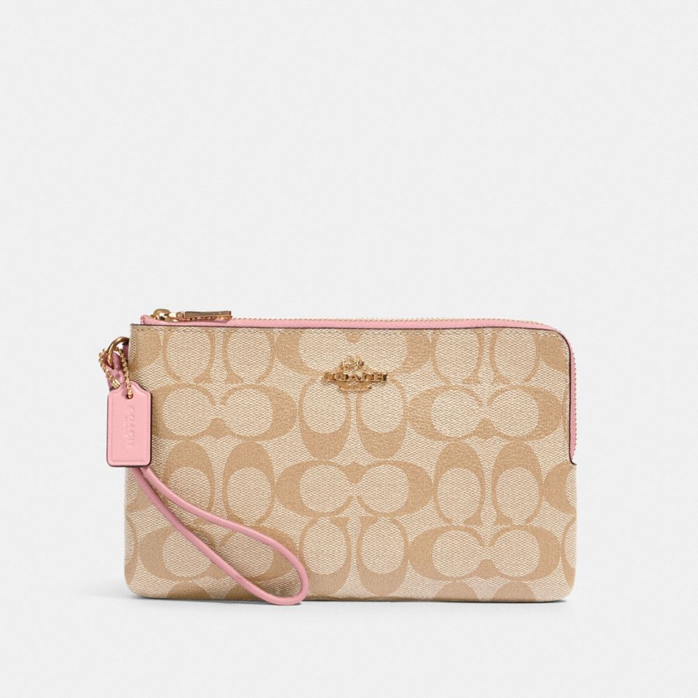 Signature coated canvas| Six credit card slots| Full-length bill compartment| Inside open pockets| Double zip closure, fabric lining| Wrist strap attached| 8 1/2" (L) x 4 1/2" (H) x 1 1/4" (W)| Fits all phone sizes up to an iPhone X and Samsung S7 Edge