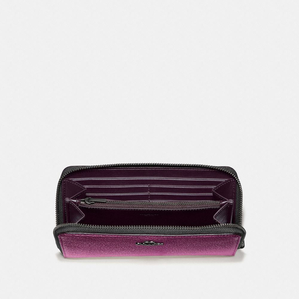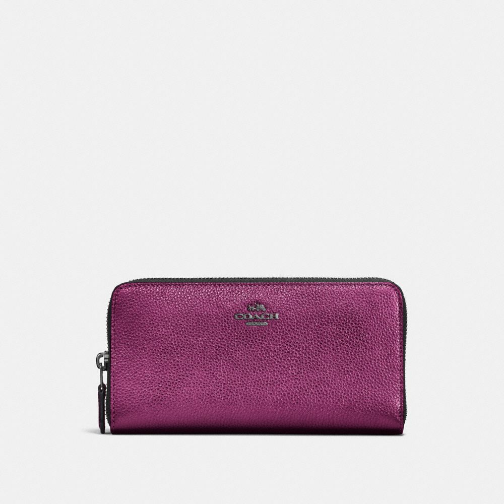 Metallic polished pebble leather| 12 credit card slots| Full-length bill compartments| Zip coin pocket| Zip-around closure| Outside open pocket| 7 1/2" (L) x 4" (H) x 3/4" (W)| Fits all phone sizes up to an iPhone X and Samsung S7 Edge