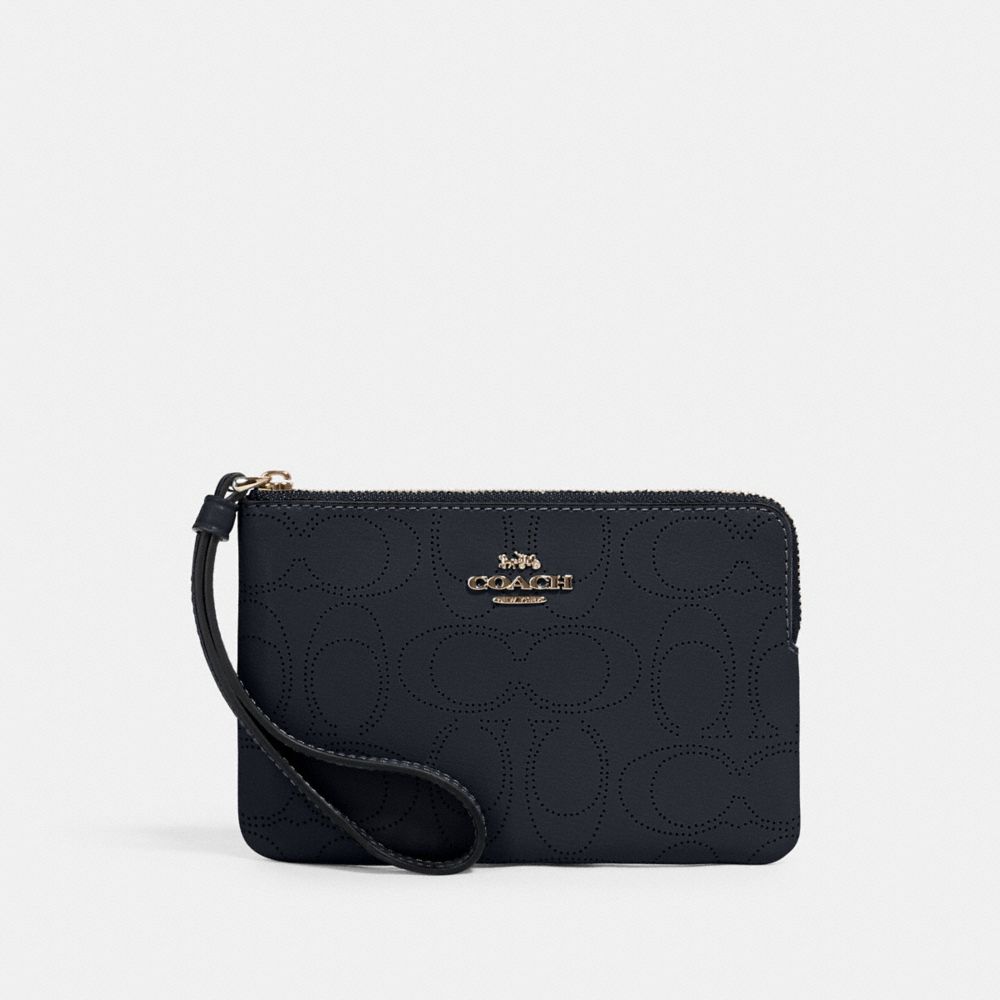Signature perforated leather| Two credit card slots| Zip-top closure, fabric lining| Wrist strap attached| 6 1/4" (L) x 4" (H) x 1/2" (W)| Fits an iPhone or Android