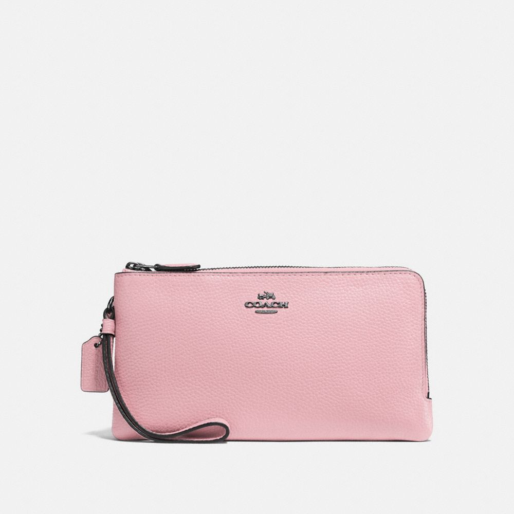 Polished pebble leather| Six credit card slots| Full-length bill compartment| Inside open pockets| Double zip closure, fabric lining| Wrist strap attached| 8 1/2" (L) x 4 1/2" (H) x 1 1/4" (W)| Fits all phone sizes up to an iPhone X and Samsung S7 Edge