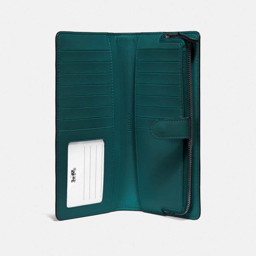Refined calf leather| 15 credit card slots| Full-length bill compartments| ID window| Zip coin pocket| Snap closure| 7 3/4" (L) x 4" (H)| Fits all phone sizes up to an iPhone X and Samsung S7 Edge