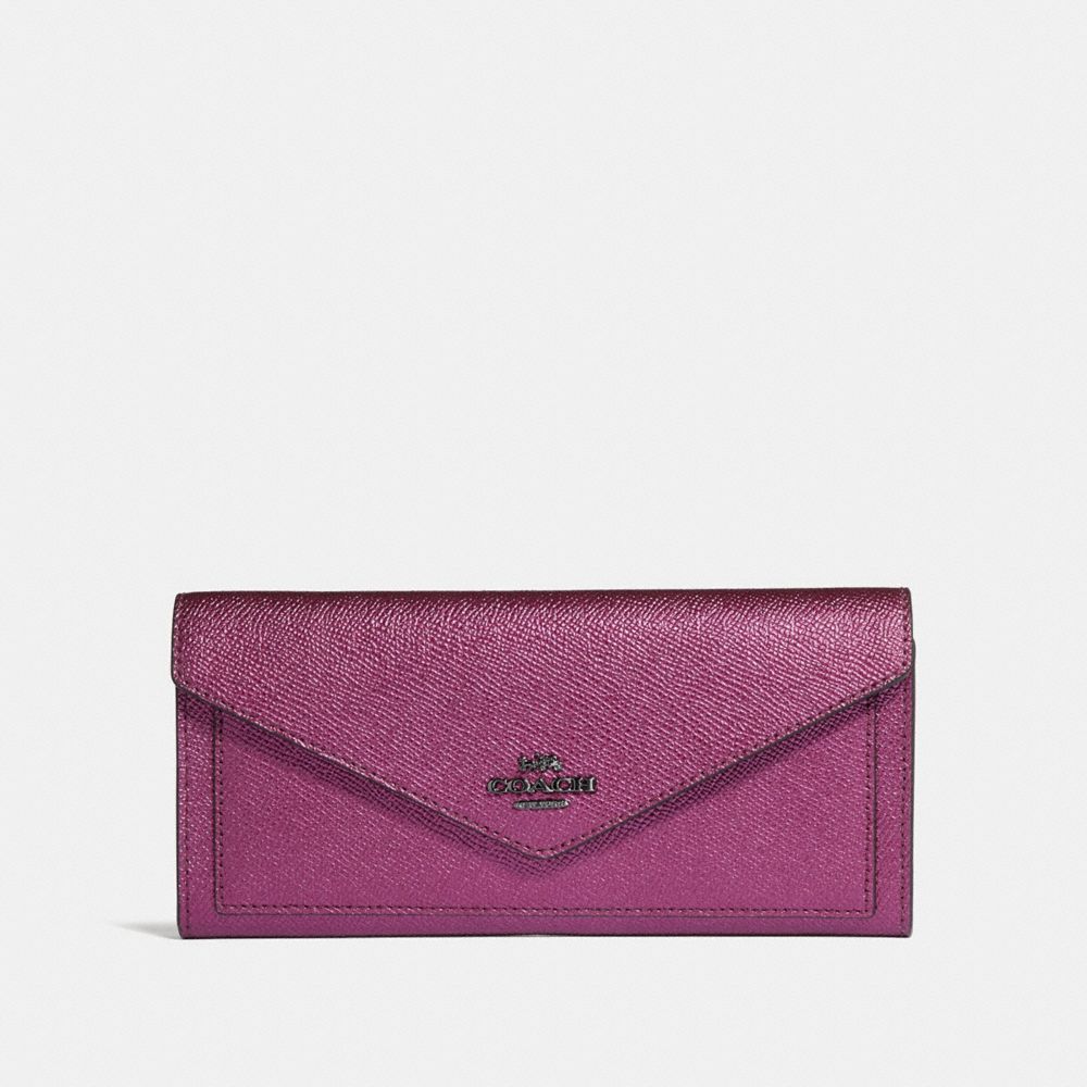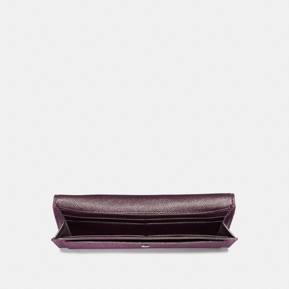 Metallic crossgrain leather| Eight credit card slots| Full-length bill compartment| Snap closure| Outside zip coin pocket| 7 3/4" (L) x 3 1/2" (H)