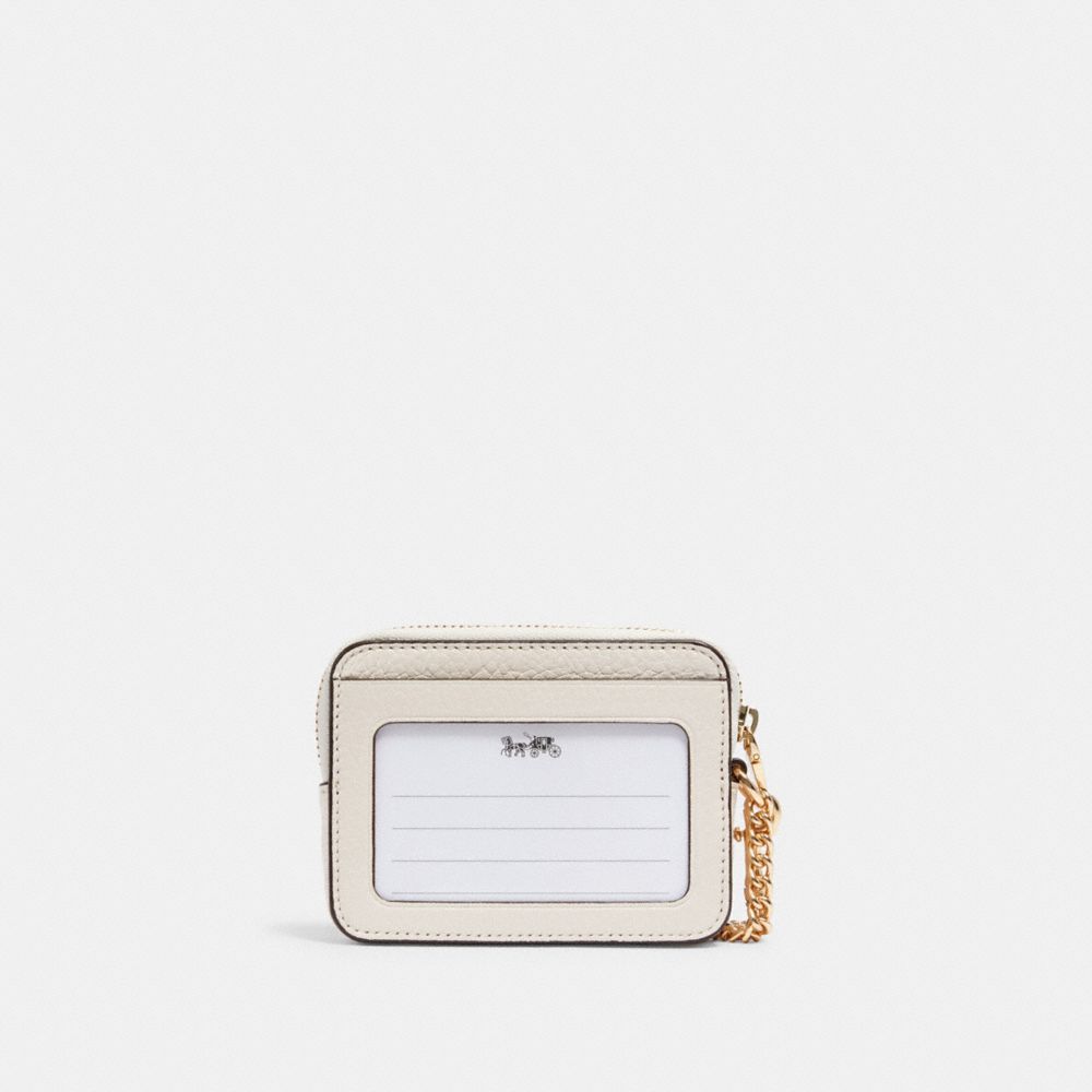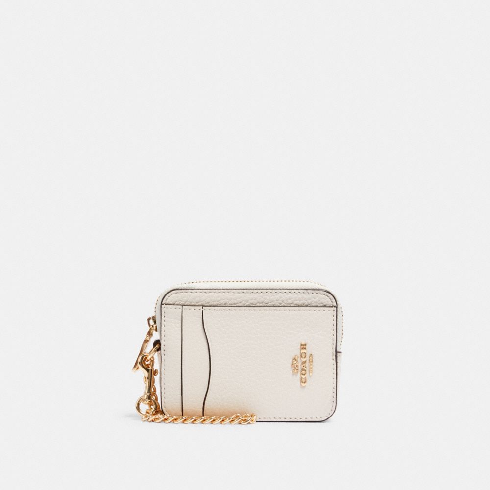 Refined pebble leather| Two credit card slots| ID window| Open pockets| Zip compartment| Chain wrist strap with dogleash clip attached| 3" (L) x 4 1/4" (H) x 3/4" (W)