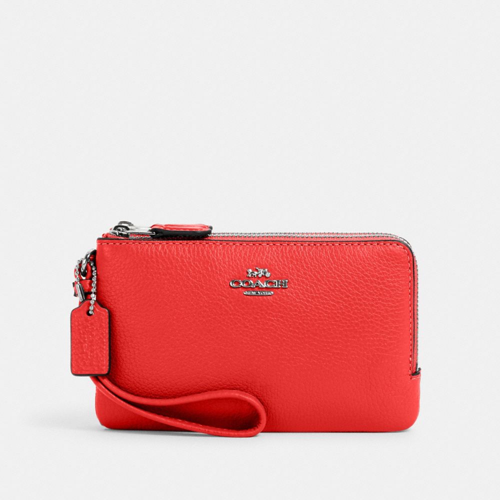 Refined pebble leather| Two credit card slots| Double zip closure, fabric lining| Wrist strap attached| 6 1/2" (L) x 3 3/4" (H) x 1 3/4" (W)