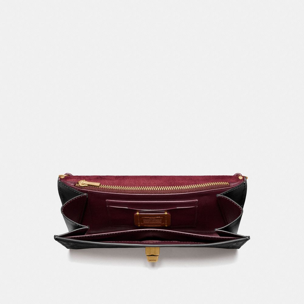 Signature refined calf leather and grain leather| Two credit card slots| Inside open and zip pockets| Turnlock closure, fabric lining| Outside open pocket| Detachable chain strap with 22" drop for shoulder or crossbody wear| 7 3/4" (L) x 5" (H) x 1 1/4" (W)