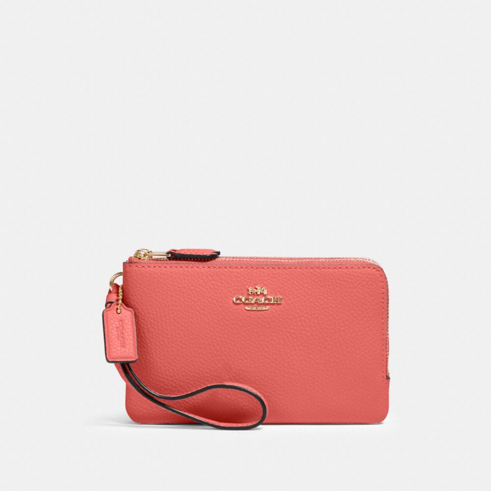 Polished pebble leather| Two credit card slots| Double zip closure, fabric lining| Wrist strap attached| 6 1/2" (L) x 3 3/4" (H) | Fits an iPhone or Android